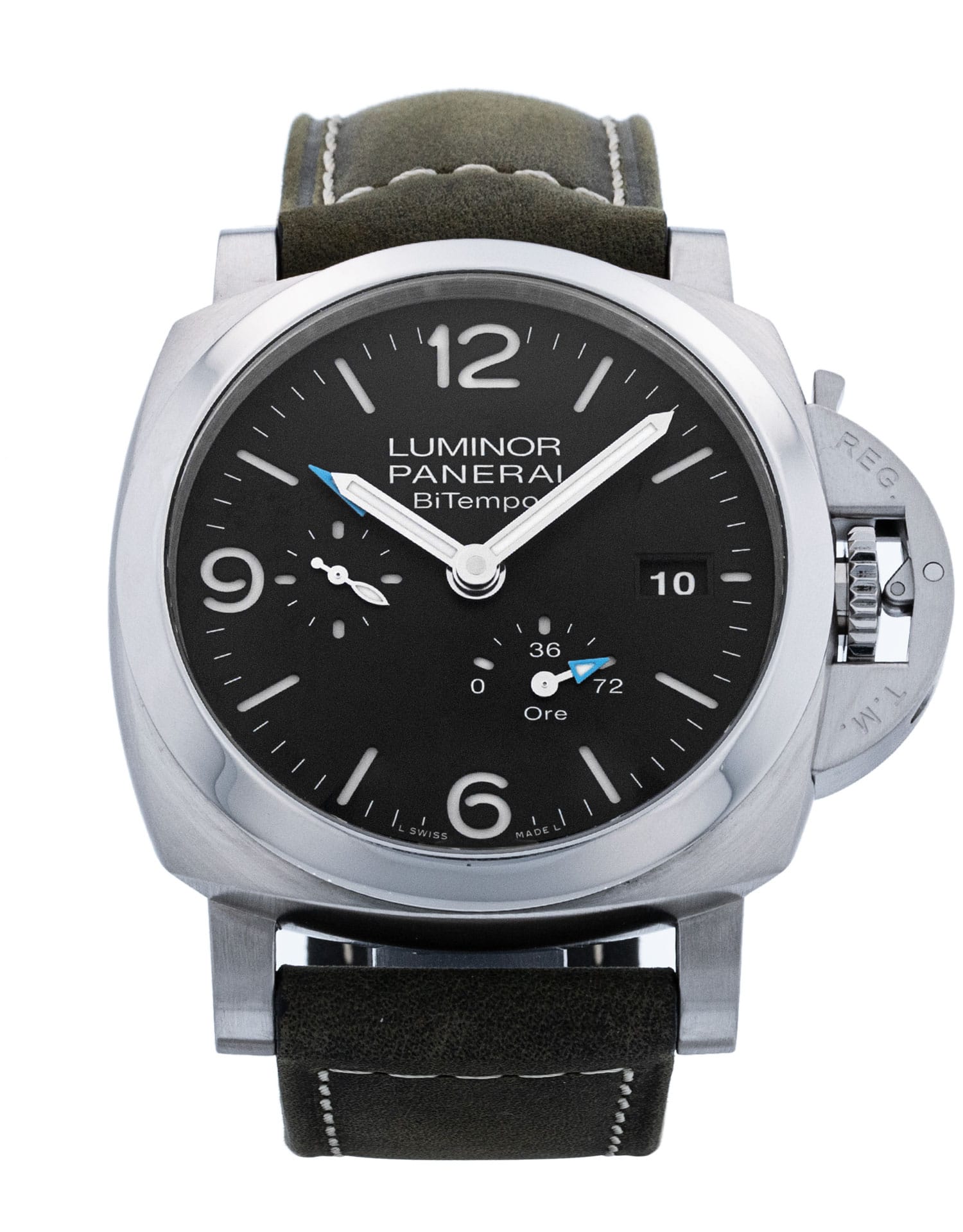 This Panerai Luminor BiTempo PAM01360 has a black quarter arabic dial and a leather strap. This Panerai has undergone a thorough inspection of accuracy, functionality and condition at our Panerai certified service centre to determine the level of reconditioning required to meet our strict standards. It has also been checked against our records to ensure authenticity. Our watches have a 24-month warranty for your peace of mind, in conjunction with any remaining manufacturer’s warranty from new or from service.