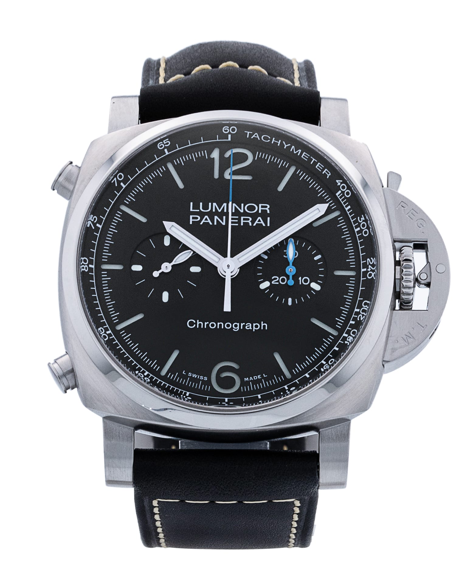 This Panerai Luminor Chrono PAM01109 has a black baton dial and a leather strap. This Panerai has undergone a thorough inspection of accuracy, functionality and condition at our Panerai certified service centre to determine the level of reconditioning required to meet our strict standards. It has also been checked against our records to ensure authenticity. All our watches have a 24-month warranty for your peace of mind.