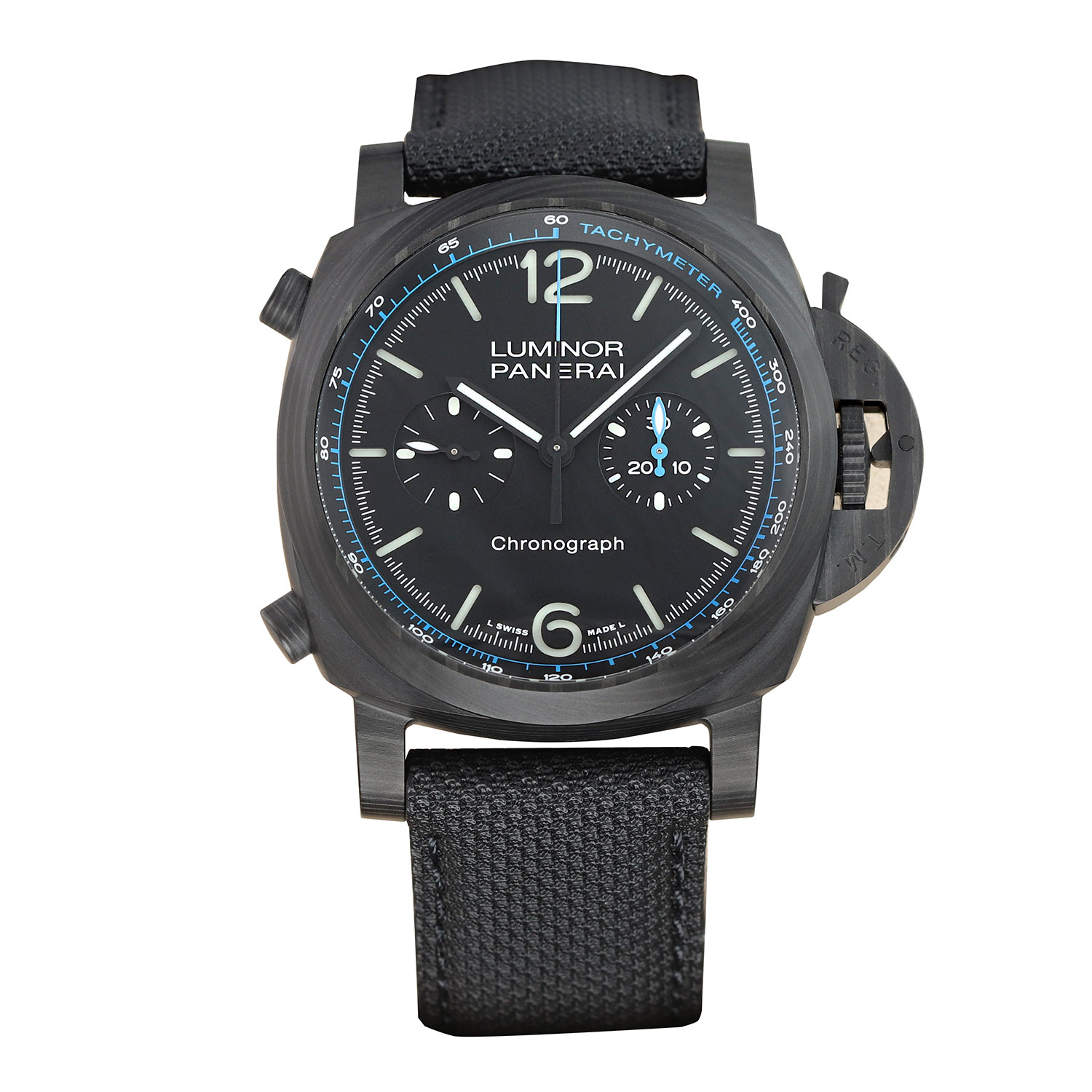 This Panerai Luminor Chrono PAM01219 has a black dial and a fabric strap. This Panerai has undergone a thorough inspection of accuracy, functionality and condition at our Panerai certified service centre to determine the level of reconditioning required to meet our strict standards. It has also been checked against our records to ensure authenticity. All our watches have a 24-month warranty for your peace of mind.