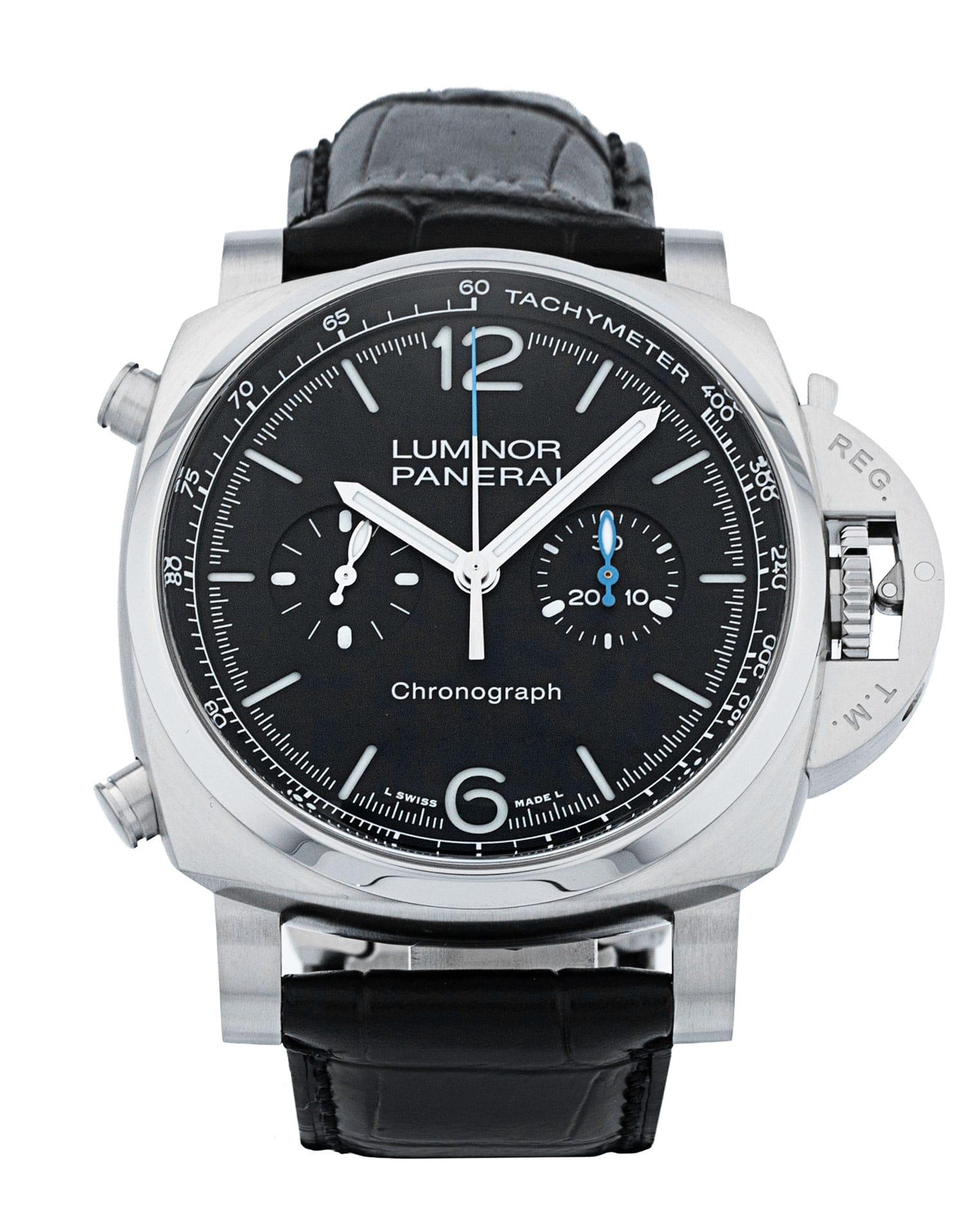 This Panerai Luminor Chrono PAM01109 has a black baton dial and a leather strap. This Panerai has undergone a thorough inspection of accuracy, functionality and condition at our Panerai certified service centre to determine the level of reconditioning required to meet our strict standards. It has also been checked against our records to ensure authenticity. All our watches have a 24-month warranty for your peace of mind.