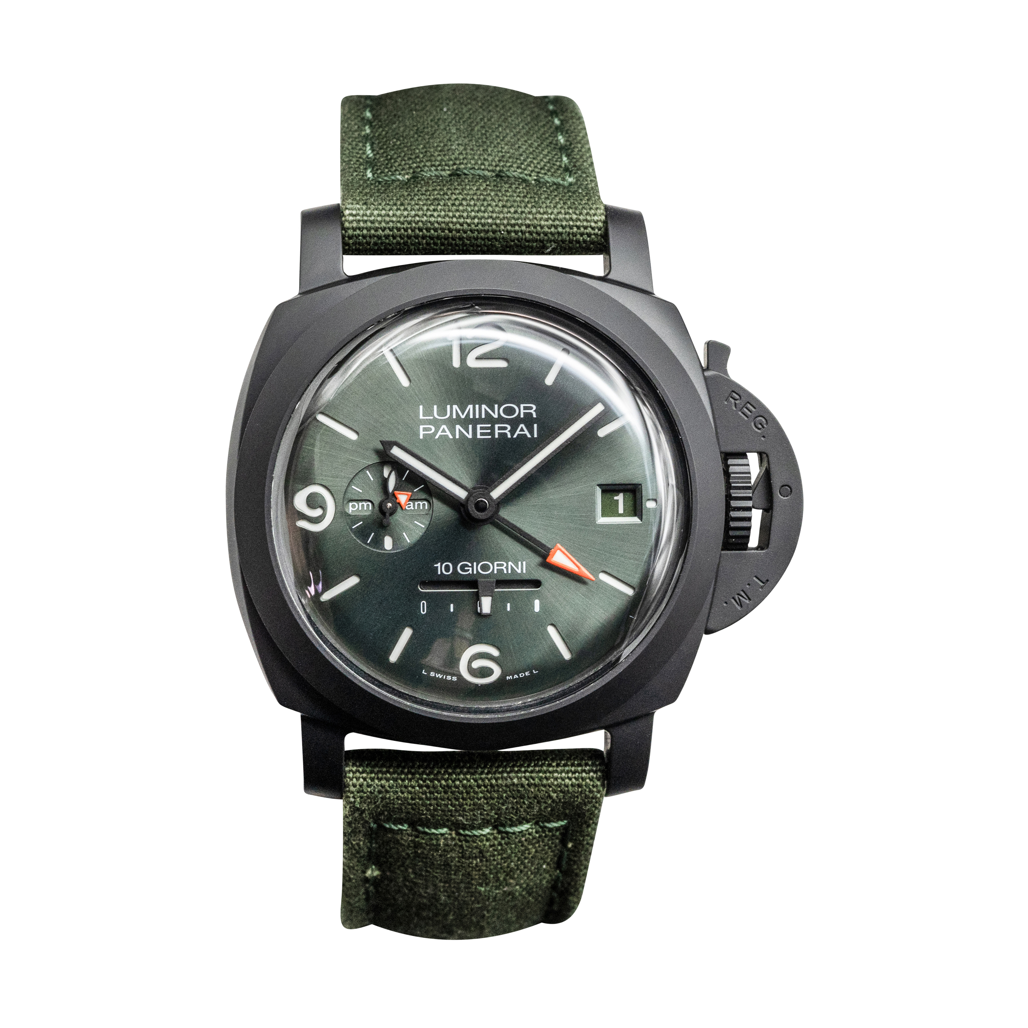 This Panerai Luminor Dieci Giorni GMT PAM01483 has a green quarter arabic dial and a fabric strap. This Panerai has undergone a thorough inspection of accuracy, functionality and condition at our Panerai certified service centre to determine the level of reconditioning required to meet our strict standards. It has also been checked against our records to ensure authenticity. All our watches have a 24-month warranty for your peace of mind.