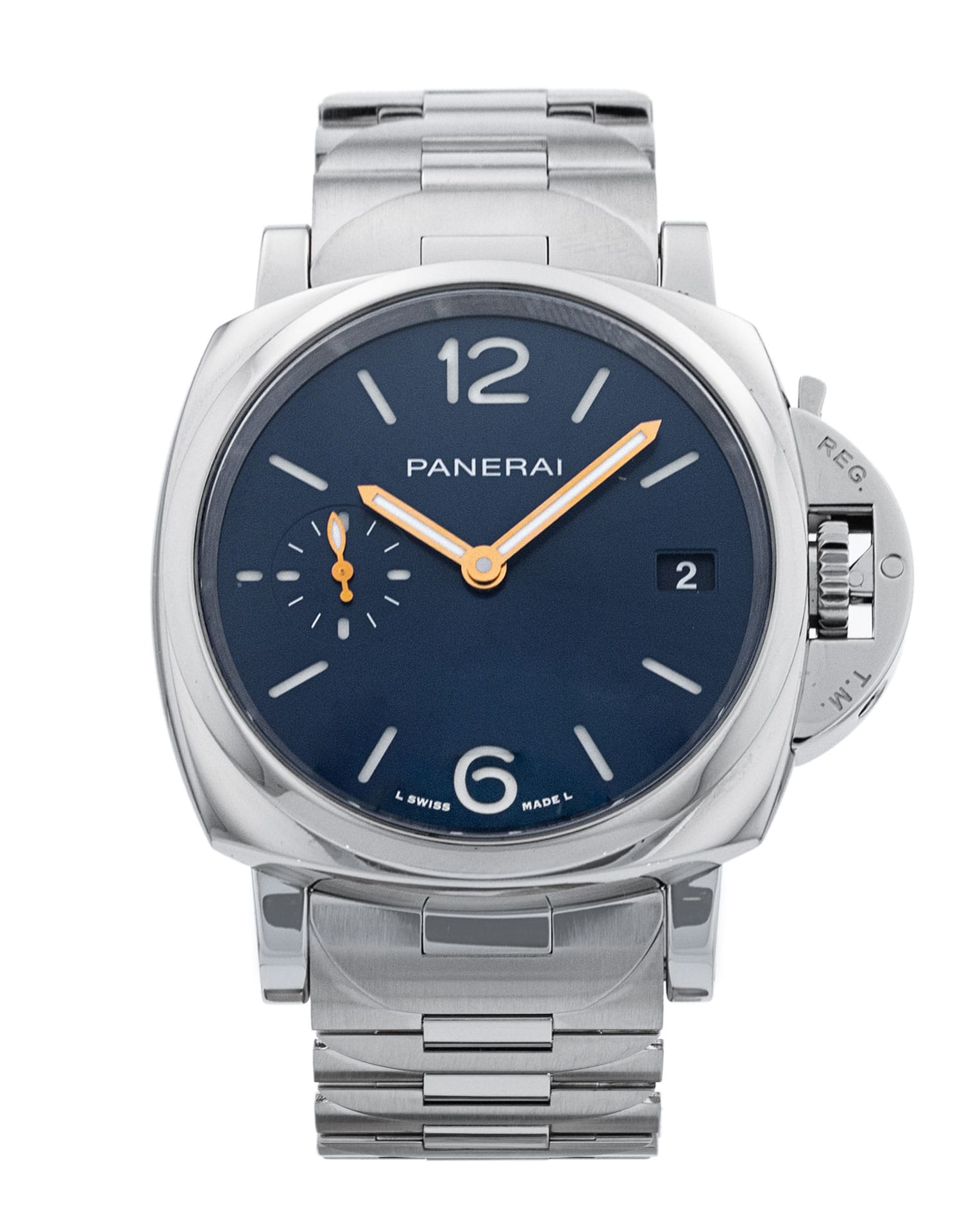 This Panerai Luminor Due PAM01123 has a blue dial and a bracelet strap. This Panerai has undergone a thorough inspection of accuracy, functionality and condition at our Panerai certified service centre to determine the level of reconditioning required to meet our strict standards. It has also been checked against our records to ensure authenticity. Our watches have a 24-month warranty for your peace of mind, in conjunction with any remaining manufacturer’s warranty from new or from service.