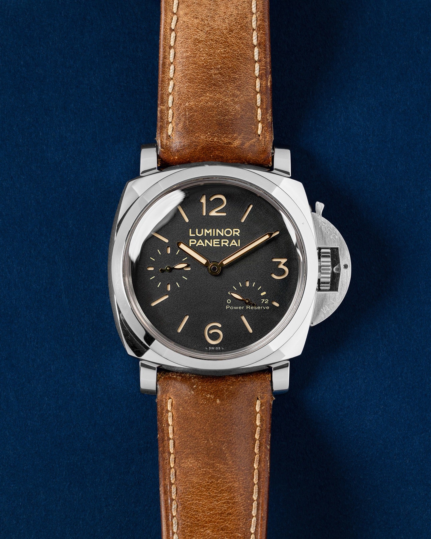 The modern Luminor design originated in the early 1990s, when Panerai finally decided to sell its prestigious watches to the civilian market after more than 50 years as a military-only contractor. Three limited edition pieces created at this time set the style for what would soon become modern Luminor. It somewhat modernised the 1940s-era look while remaining true to the brand's historical aesthetics, adding strong clean lines and new curves to the distinctive cushion case, and a crown guard to boost water resistance. This lovely example has an in-house movement, the P.3002, with a power reserve of three days that is displayed in a sophisticated retrograde indicator on the dial.