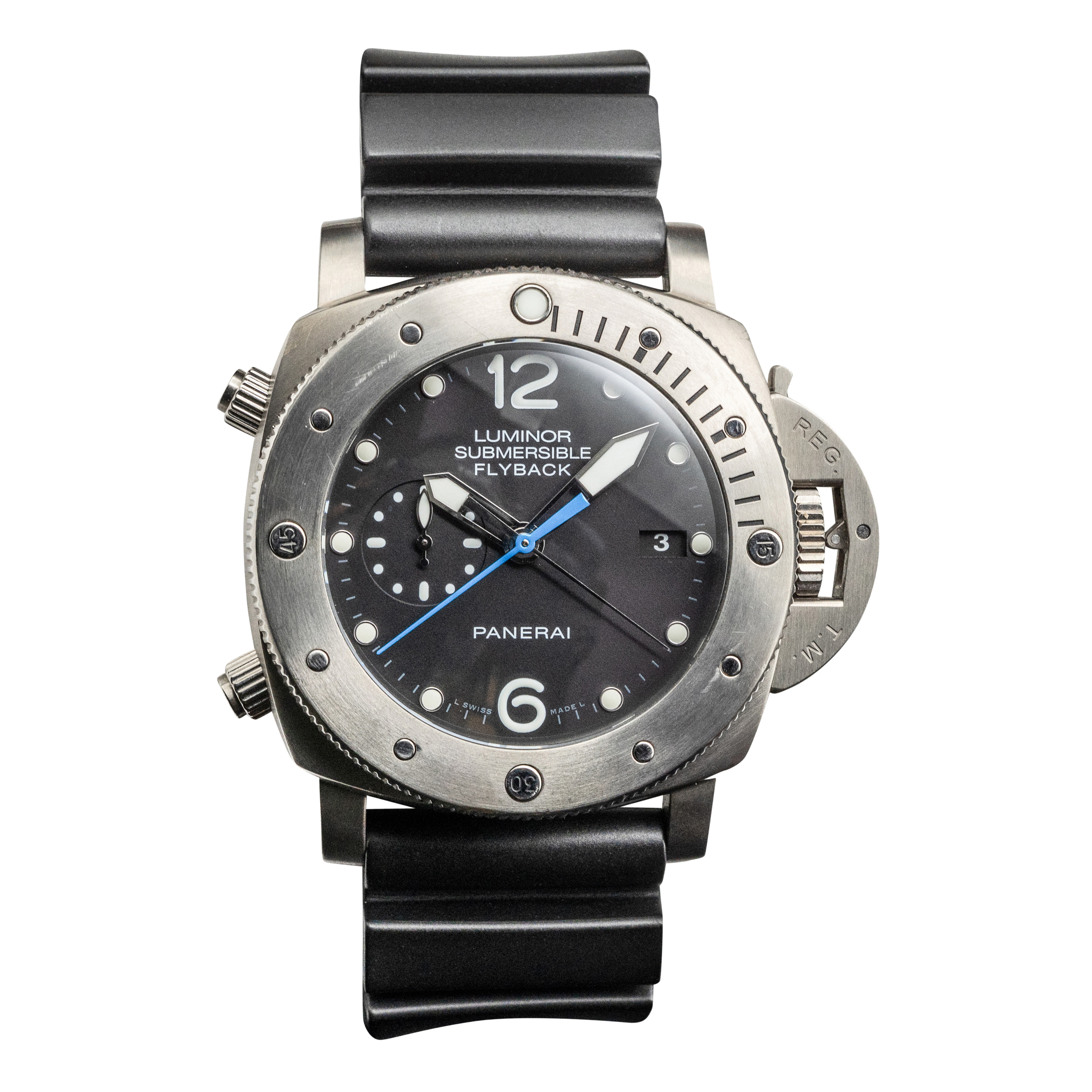 This stunning Luminor features Panerai's magnificent new in-house movement, the P.9100. The watch is unusual in being a chronograph with no subdial registers (the display at 9 o'clock is a regular small seconds). Instead, both chronograph seconds and (jumping) minutes are shown by hands from the centre, in blue and steel respectively. It's a visual delight that unclutters the striking design of this titanium Submersible, with its iconic left-hand pushers, making the stopwatch effortlessly legible. It's only augmented by the watch's prestigious flyback functionality: press the 8 o'clock pusher and the hands leap back to their starting positions, continuing to run smoothly from there.