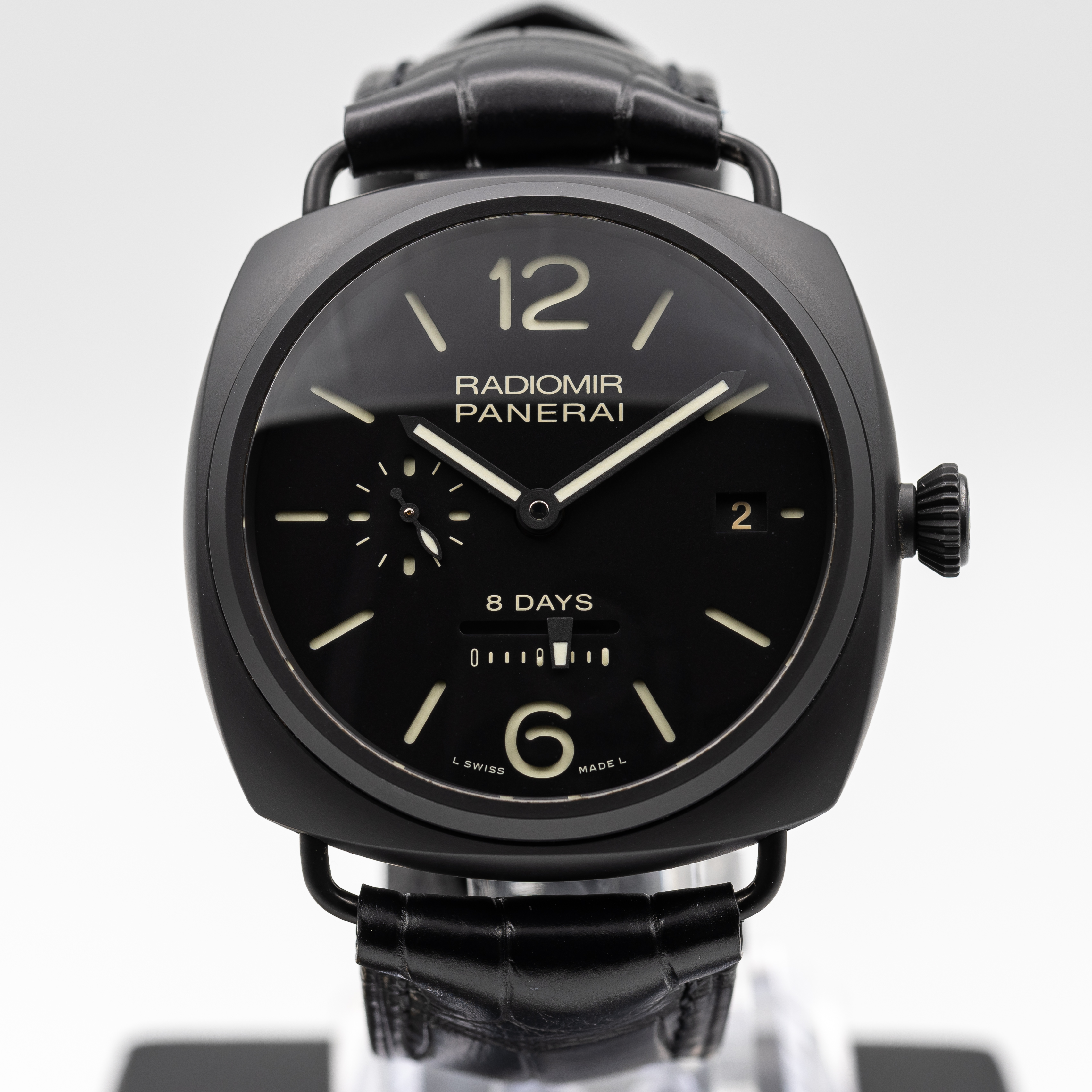 Panerai has several watches with amazingly long power reserves, yet even by its standards, this 8-day Radiomir is pretty darn cool. The watch harnesses three large mainspring barrels to generate this much power, and the superb mechanical specs of the in-house P.2002 movement ensure that this energy is distributed cleanly and evenly without any compromise of timekeeping precision. In addition to the power reserve, which has a 'linear' display at 6 o'clock, the watch also boasts a stunning black aesthetic made possible by the extraordinary ceramic case material, formed from the isostatic pressing of zirconium oxide.