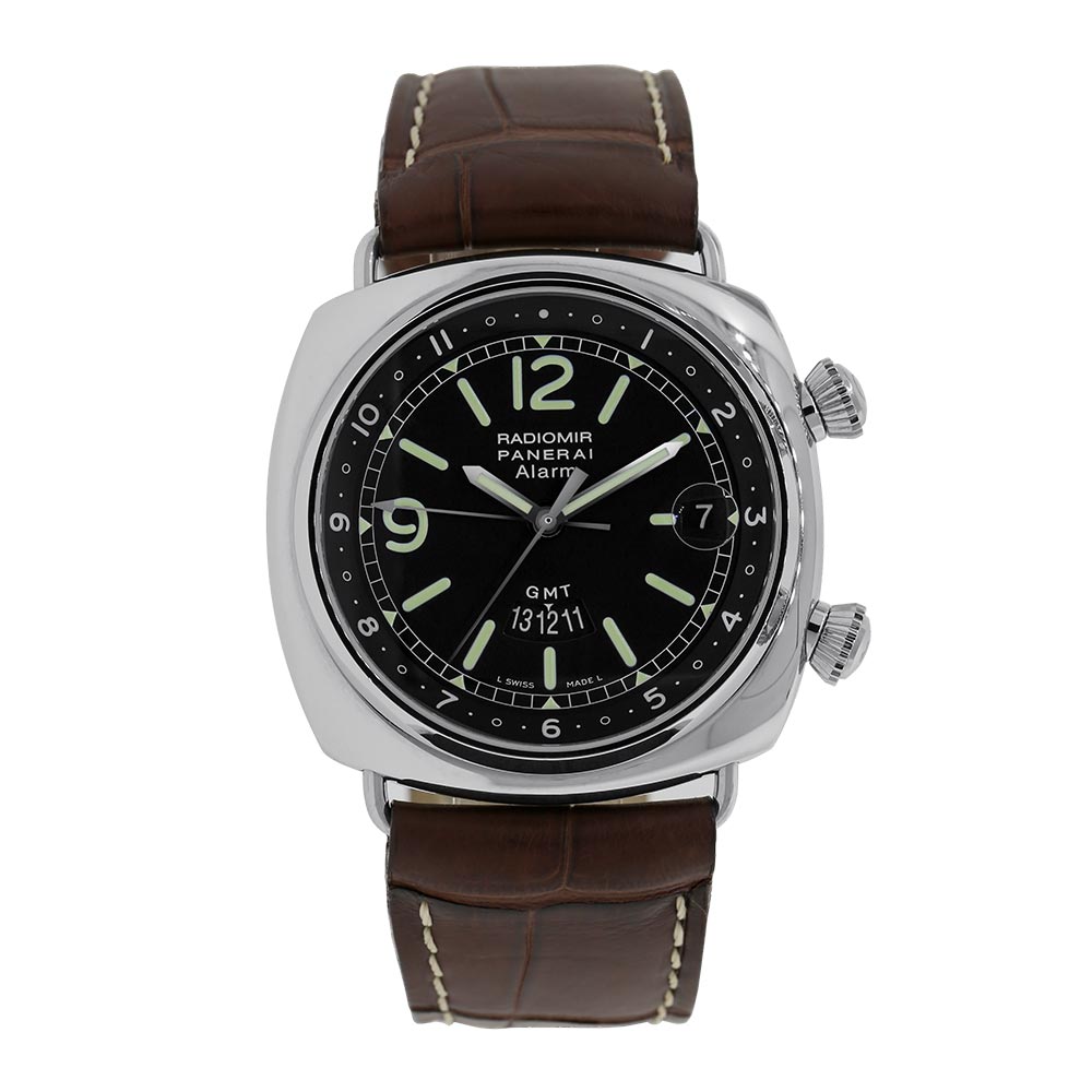 This Panerai Radiomir GMT PAM00098 has a black baton dial and a leather strap. This Panerai has undergone a thorough inspection of accuracy, functionality and condition at our Panerai certified service centre to determine the level of reconditioning required to meet our strict standards. It has also been checked against our records to ensure authenticity. All our watches have a 24-month warranty for your peace of mind.