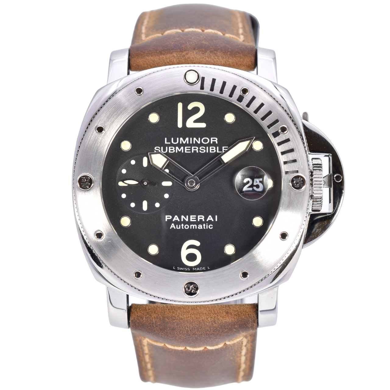 This Panerai Royal Navy Clearance Diver PAM00664 has a black baton dial and a leather strap. This Panerai has undergone a thorough inspection of accuracy, functionality and condition at our Panerai certified service centre to determine the level of reconditioning required to meet our strict standards. It has also been checked against our records to ensure authenticity. All our watches have a 24-month warranty for your peace of mind.
