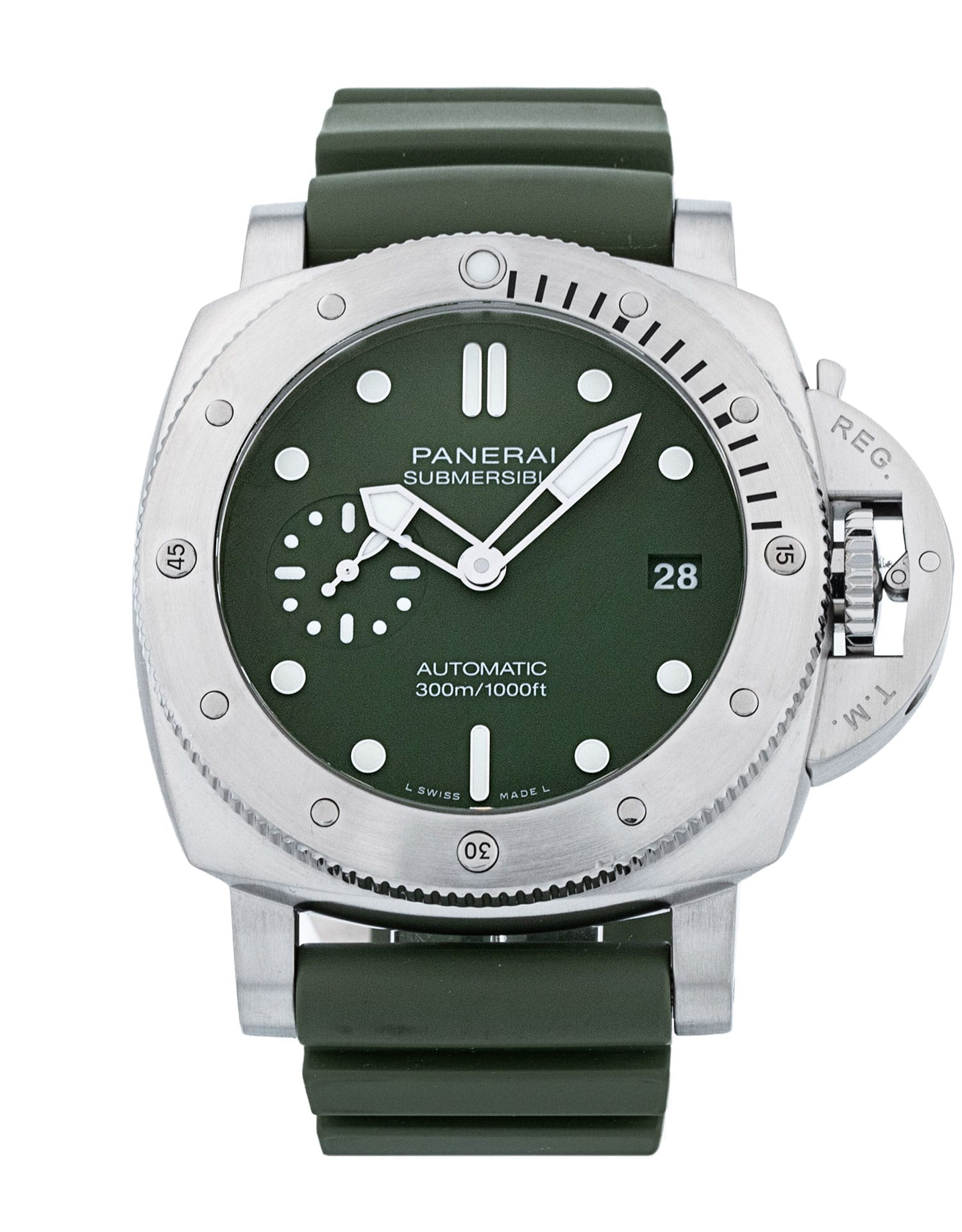 This Panerai Submersible PAM01055 has a green dial and a rubber strap. This Panerai has undergone a thorough inspection of accuracy, functionality and condition at our Panerai certified service centre to determine the level of reconditioning required to meet our strict standards. It has also been checked against our records to ensure authenticity. Our watches have a 24-month warranty for your peace of mind, in conjunction with any remaining manufacturer’s warranty from new or from service.