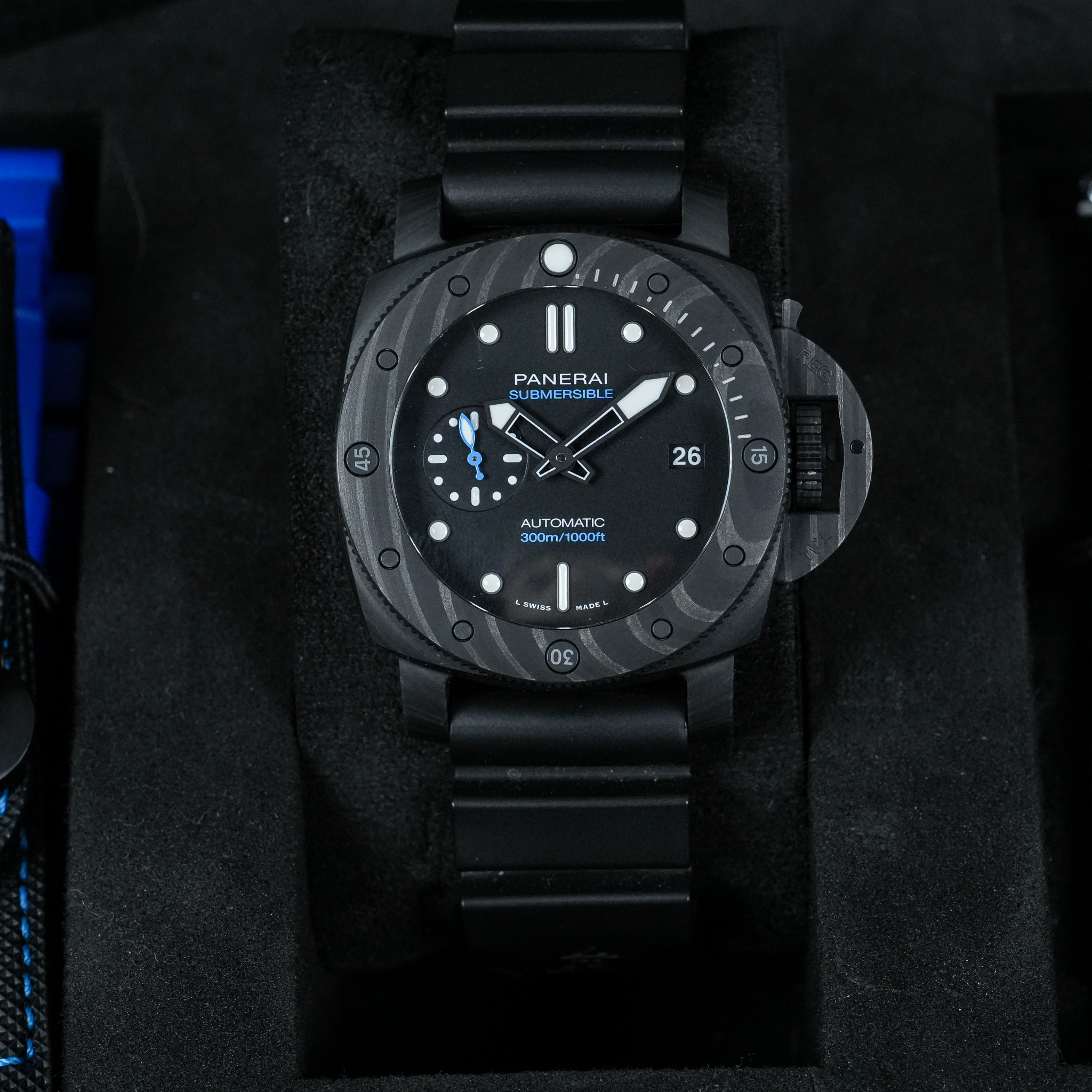 This Panerai Submersible PAM01231 has a black dial and a rubber strap. This Panerai has undergone a thorough inspection of accuracy, functionality and condition at our Panerai certified service centre to determine the level of reconditioning required to meet our strict standards. It has also been checked against our records to ensure authenticity. Our watches have a 24-month warranty for your peace of mind, in conjunction with any remaining manufacturer’s warranty from new or from service.