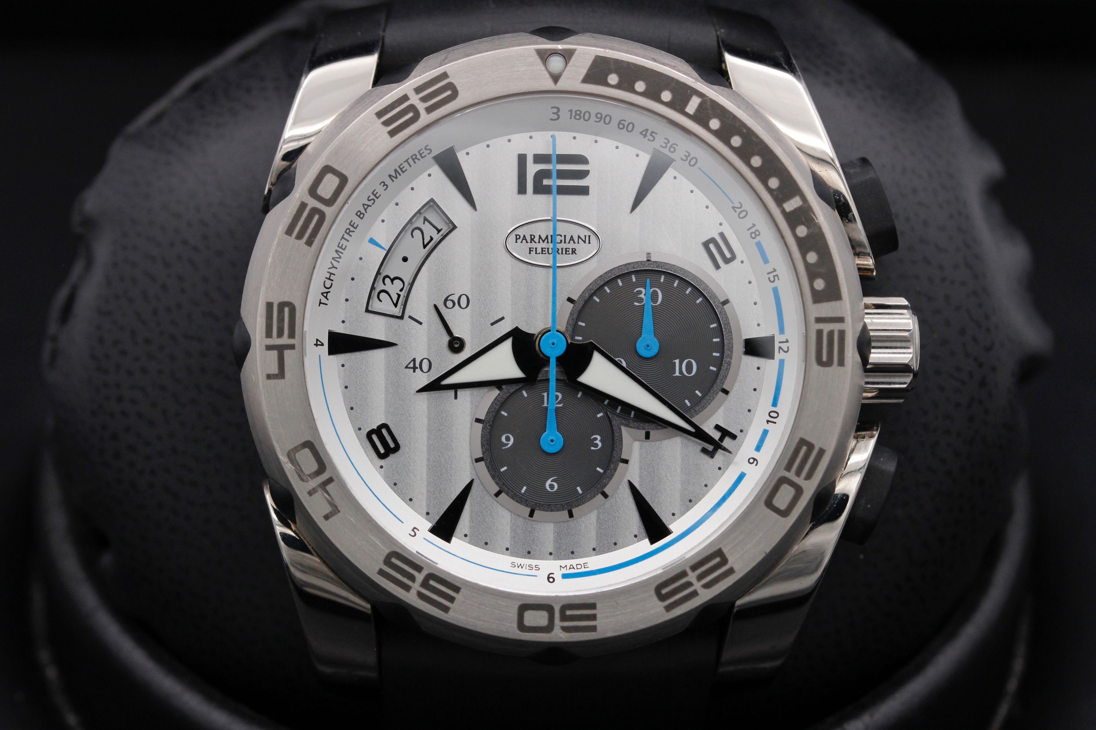 This Parmigiani Fleurier pershing PFC504-2510100-X01402 has a silver dial and a rubber strap. This Parmigiani has undergone a thorough inspection of accuracy, functionality and condition to determine the level of reconditioning required to meet our strict standards. It has also been referenced against technical documents and manufacturer records where available to ensure authenticity and a clean history. All our watches have a 24-month warranty for your peace of mind.