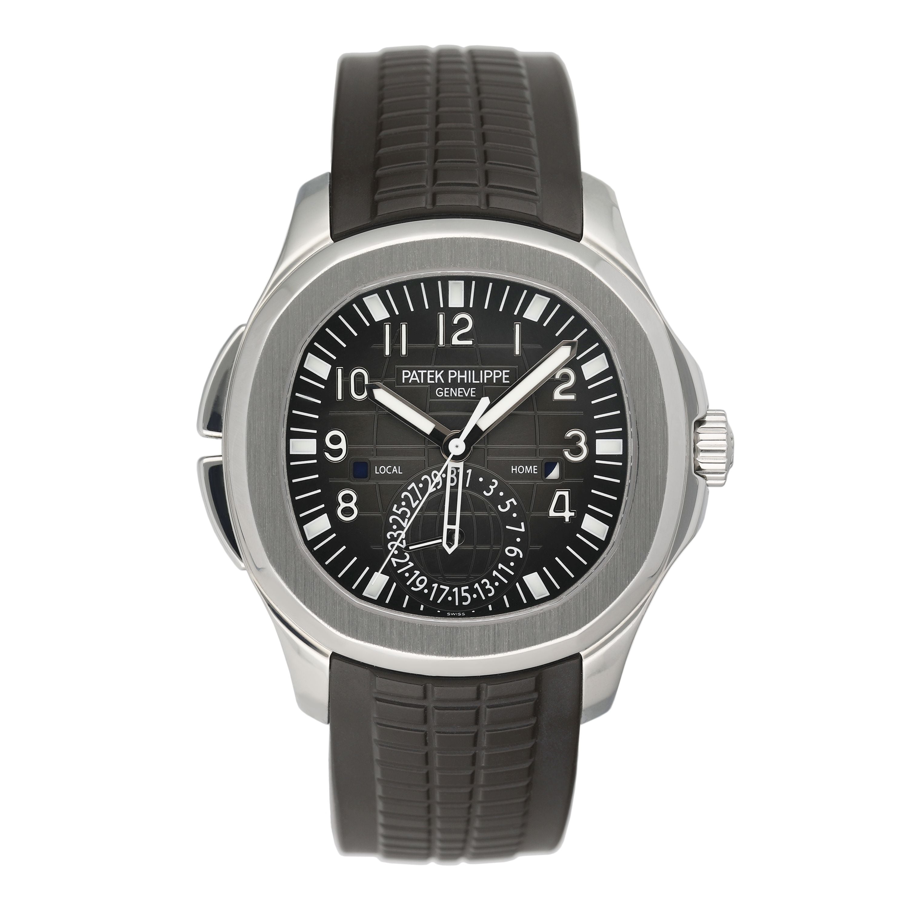 This Patek Philippe Aquanaut 5164A-001 has a black arabic dial and a rubber strap. This Patek Philippe has undergone a thorough inspection of water resistance, accuracy, functionality and condition to determine the level of reconditioning required to meet our strict standards. It has also been referenced against technical documents and manufacturer records where available to ensure authenticity and a clean history. All our watches have a 24-month warranty for your peace of mind.