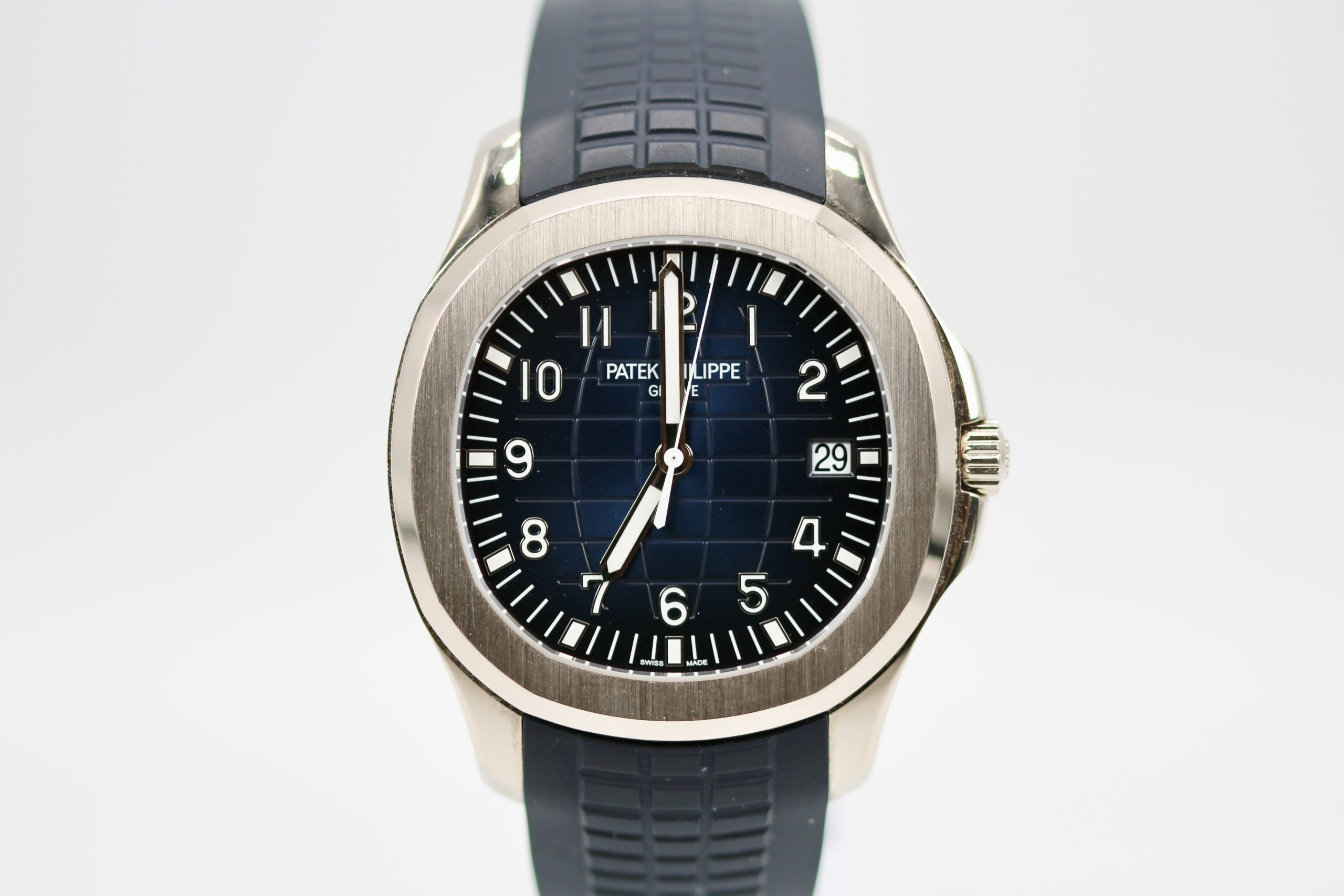This Patek Philippe Aquanaut 5168G-001 has a blue arabic dial and a rubber strap. This Patek Philippe has undergone a thorough inspection of water resistance, accuracy, functionality and condition to determine the level of reconditioning required to meet our strict standards. It has also been referenced against technical documents and manufacturer records where available to ensure authenticity and a clean history. All our watches have a 24-month warranty for your peace of mind.
