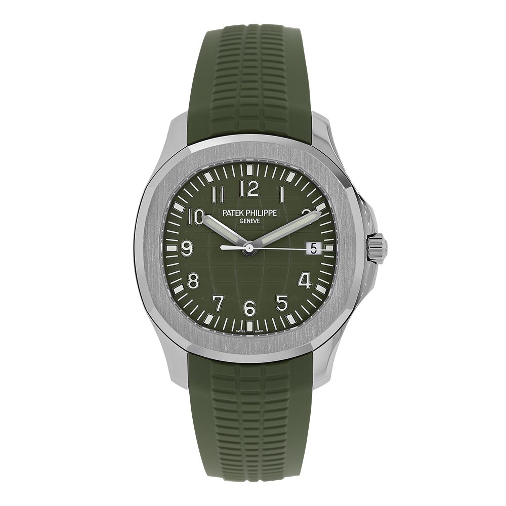 When Patek Philippe released the Aquanaut in 1997 it was considered part of the Gerald Genta-designed Nautilus collection and shared some of its famous design elements, including the rounded octagonal bezel that drew inspiration from a porthole. It was also the first Patek Philippe to come on a rubber strap. Having branched off from the Nautilus family and gone its own way, it’s now a popular watch within the brand’s catalogue and is perhaps its sportiest model, combining a dynamic and compact design with casual elegance. This model, with a khaki grenade-pattern dial featuring applied Arabic numerals in white gold, comes on a matching green rubber strap. The white gold case, a fraction over 42mm, houses the automatic Caliber 324 S C which holds a power reserve of up to 45 hours. The movement is visible through the case back, revealing the 21k gold rotor engraved with the brand’s Calatrava cross and decorated with côte de Genève stripes.