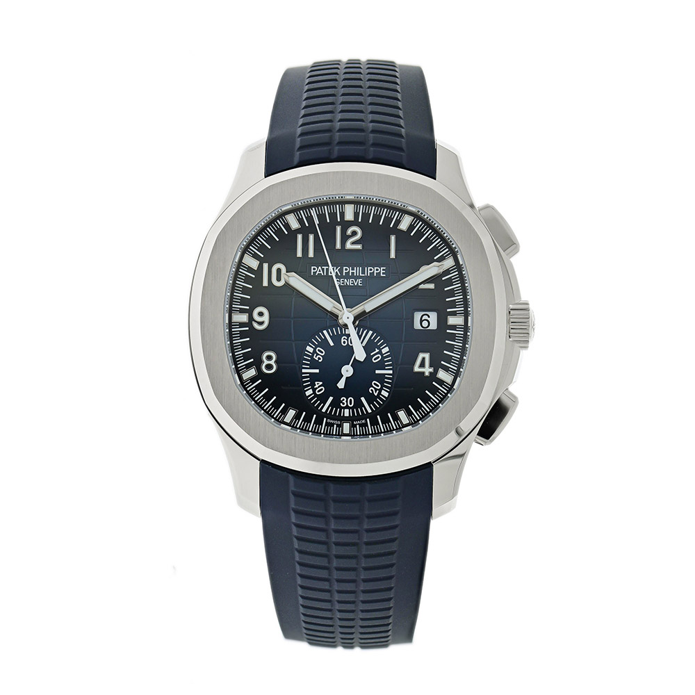 When Patek Philippe released the Aquanaut in 1997 it was considered part of the Gerald Genta-designed Nautilus collection and shared some of its famous design elements, including the rounded octagonal bezel that drew inspiration from a porthole. It was also the first Patek Philippe to come on a rubber strap. Having branched off from the Nautilus family and gone its own way, it’s now a popular watch within the brand’s catalogue and is perhaps its sportiest model, combining a dynamic and compact design with casual elegance. This flyback chronograph model is the first of its kind in white gold and pairs a gradient blue ‘grenade’ pattern dial with midnight-blue rubber strap. The sub-dial at 6 o’clock comprises the 60-minute counter and there’s a date aperture at 3 o’clock. It runs on the automatic Caliber CH 28-520 S C which holds a power reserve of up to 45 hours and is visible through the case back, revealing the 21k gold rotor engraved with the brand’s Calatrava cross. This is a versatile luxury sports watch that has seen its demand soar in recent years.