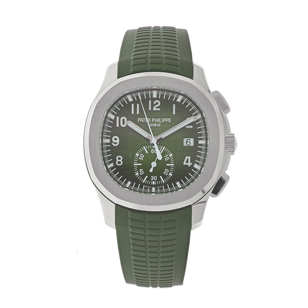 This Patek Philippe Aquanaut 5968G-010 has a green arabic dial and a rubber strap. This Patek Philippe has undergone a thorough inspection of water resistance, accuracy, functionality and condition to determine the level of reconditioning required to meet our strict standards. It has also been referenced against technical documents and manufacturer records where available to ensure authenticity and a clean history. All our watches have a 24-month warranty for your peace of mind.