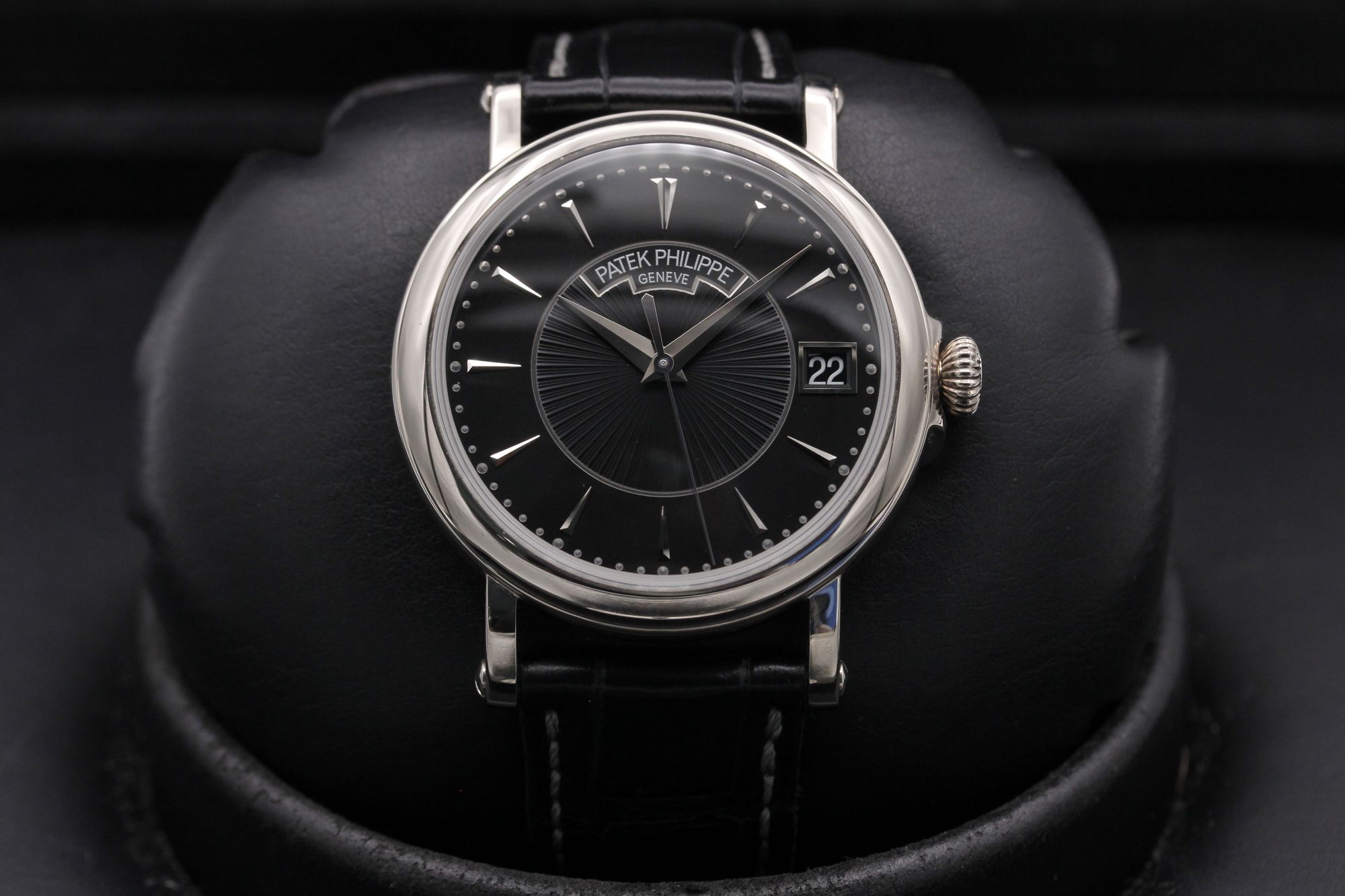 This Patek Philippe Calatrava 5153G-001 has a black baton dial and a leather strap. This Patek Philippe has undergone a thorough inspection of water resistance, accuracy, functionality and condition to determine the level of reconditioning required to meet our strict standards. It has also been referenced against technical documents and manufacturer records where available to ensure authenticity and a clean history. All our watches have a 24-month warranty for your peace of mind.