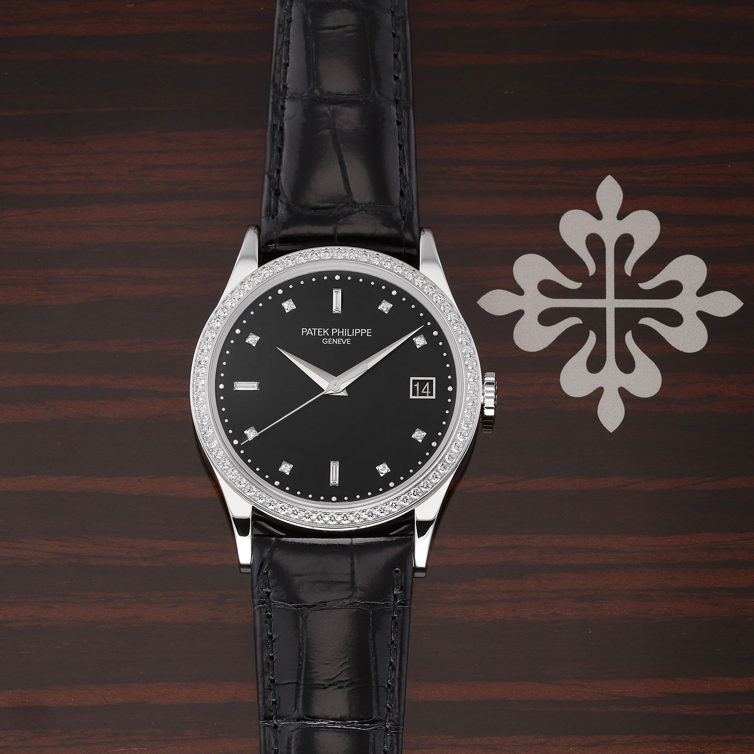 This Patek Philippe Calatrava 5297G-001 has a black diamond dial and a leather strap. This Patek Philippe has undergone a thorough inspection of water resistance, accuracy, functionality and condition to determine the level of reconditioning required to meet our strict standards. It has also been referenced against technical documents and manufacturer records where available to ensure authenticity and a clean history. All our watches have a 24-month warranty for your peace of mind.