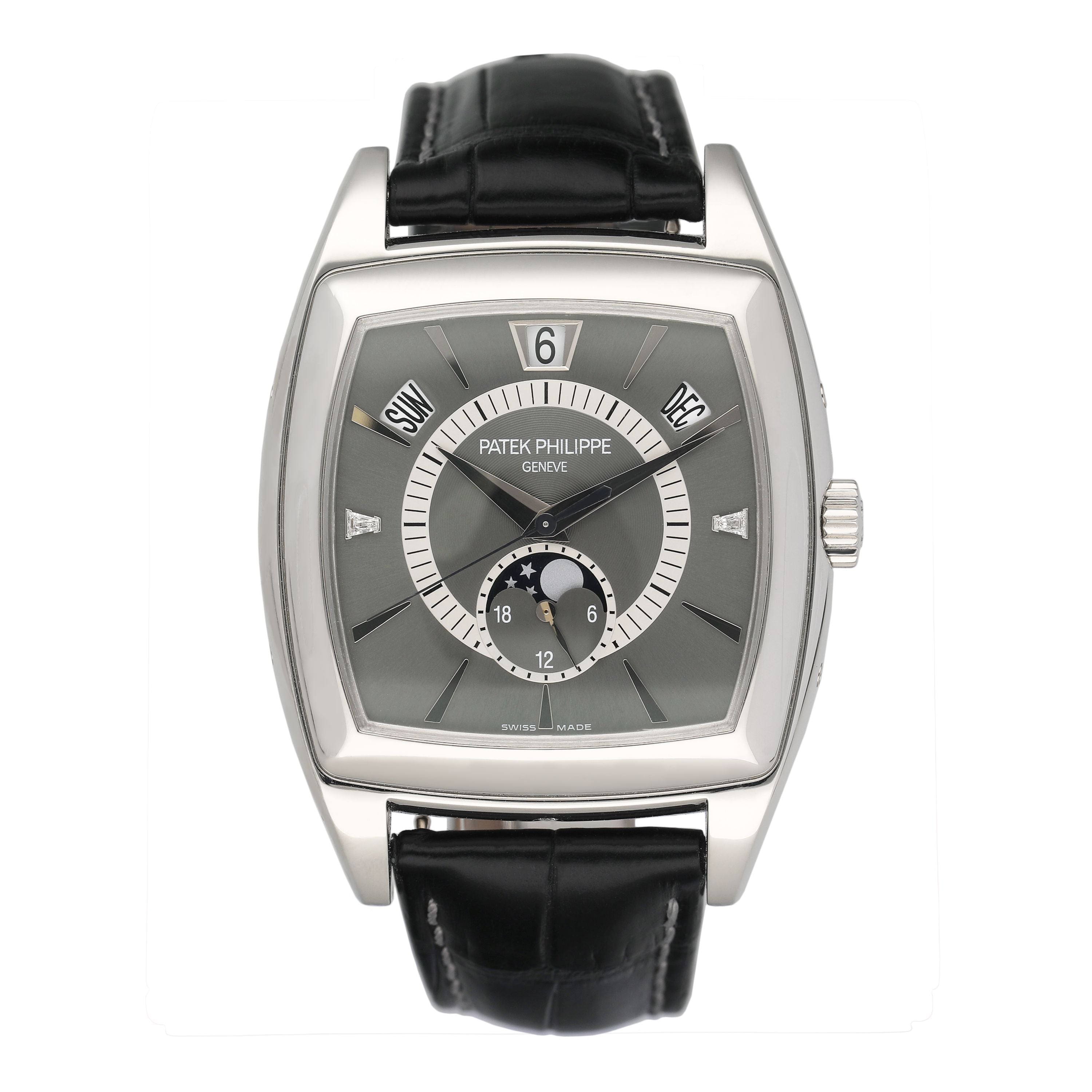 This Patek Philippe Complications 5135P has a grey baton dial and a leather strap. This Patek Philippe has undergone a thorough inspection of water resistance, accuracy, functionality and condition to determine the level of reconditioning required to meet our strict standards. It has also been referenced against technical documents and manufacturer records where available to ensure authenticity and a clean history. All our watches have a 24-month warranty for your peace of mind.