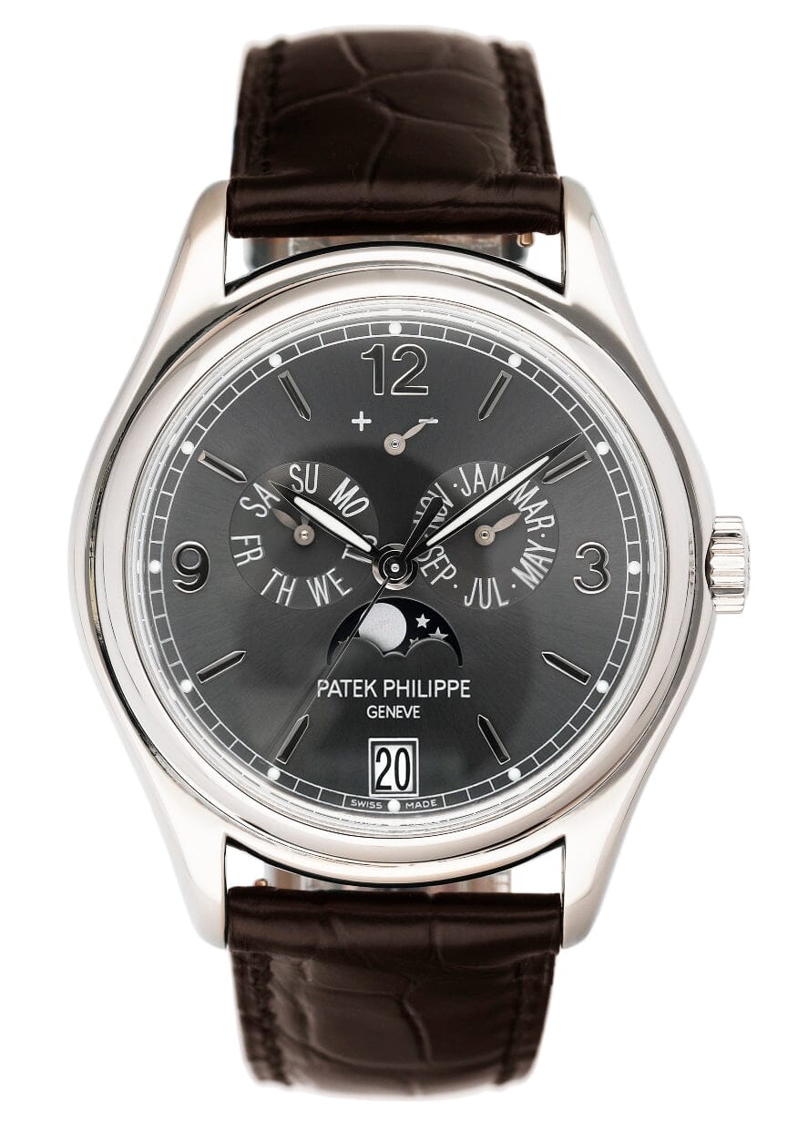 This Patek Philippe Complications 5146G-010 has a grey quarter arabic dial and a leather strap. This Patek Philippe has undergone a thorough inspection of water resistance, accuracy, functionality and condition to determine the level of reconditioning required to meet our strict standards. It has also been referenced against technical documents and manufacturer records where available to ensure authenticity and a clean history. All our watches have a 24-month warranty for your peace of mind.