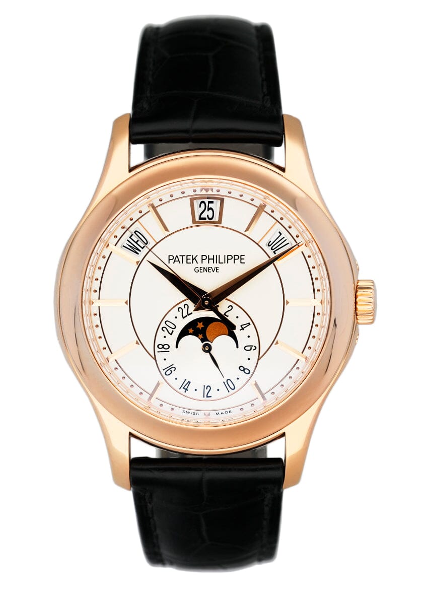 This Patek Philippe Complications 5205R-001 has a ivory baton dial and a leather strap. This Patek Philippe has undergone a thorough inspection of water resistance, accuracy, functionality and condition to determine the level of reconditioning required to meet our strict standards. It has also been referenced against technical documents and manufacturer records where available to ensure authenticity and a clean history. All our watches have a 24-month warranty for your peace of mind.