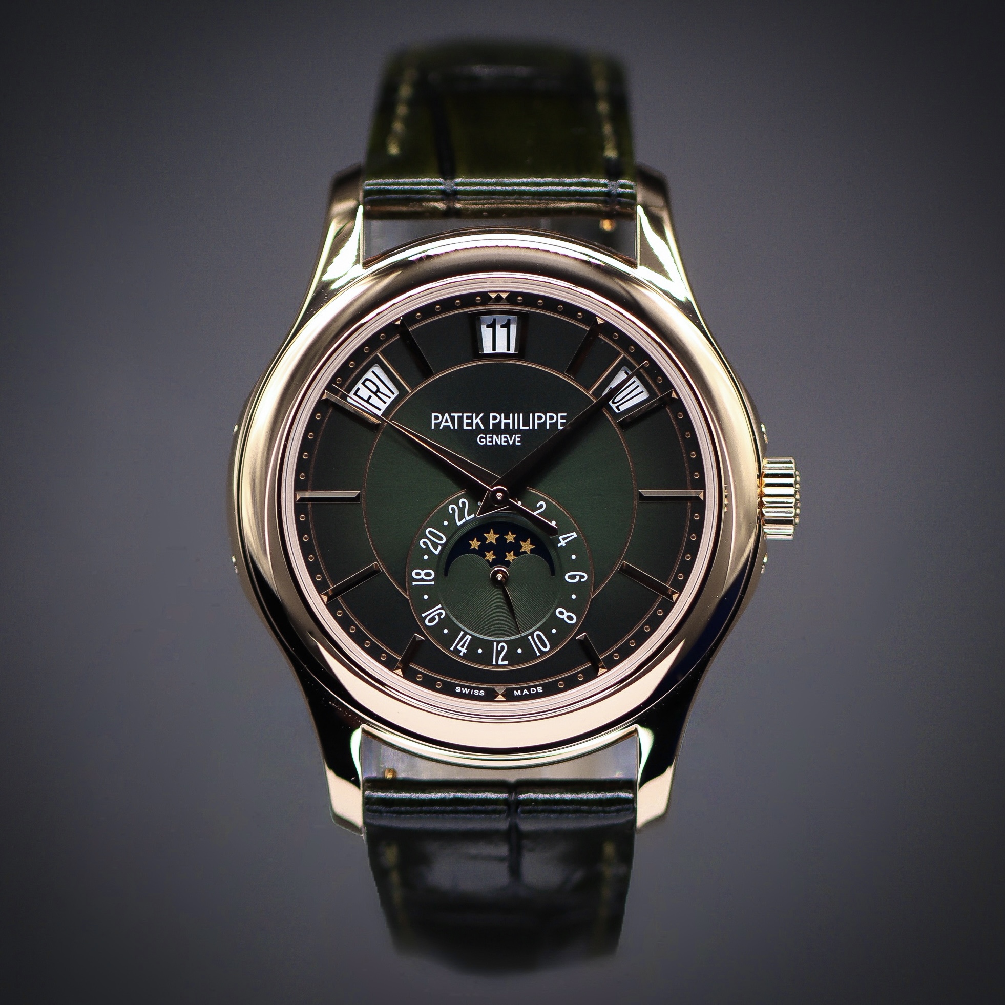 This Patek Philippe Complications 5205R-011 has a olive green baton dial and a leather strap. This Patek Philippe has undergone a thorough inspection of water resistance, accuracy, functionality and condition to determine the level of reconditioning required to meet our strict standards. It has also been referenced against technical documents and manufacturer records where available to ensure authenticity and a clean history. Our watches have a 24-month warranty for your peace of mind, in conjunction with any remaining manufacturer’s warranty from new or from service.