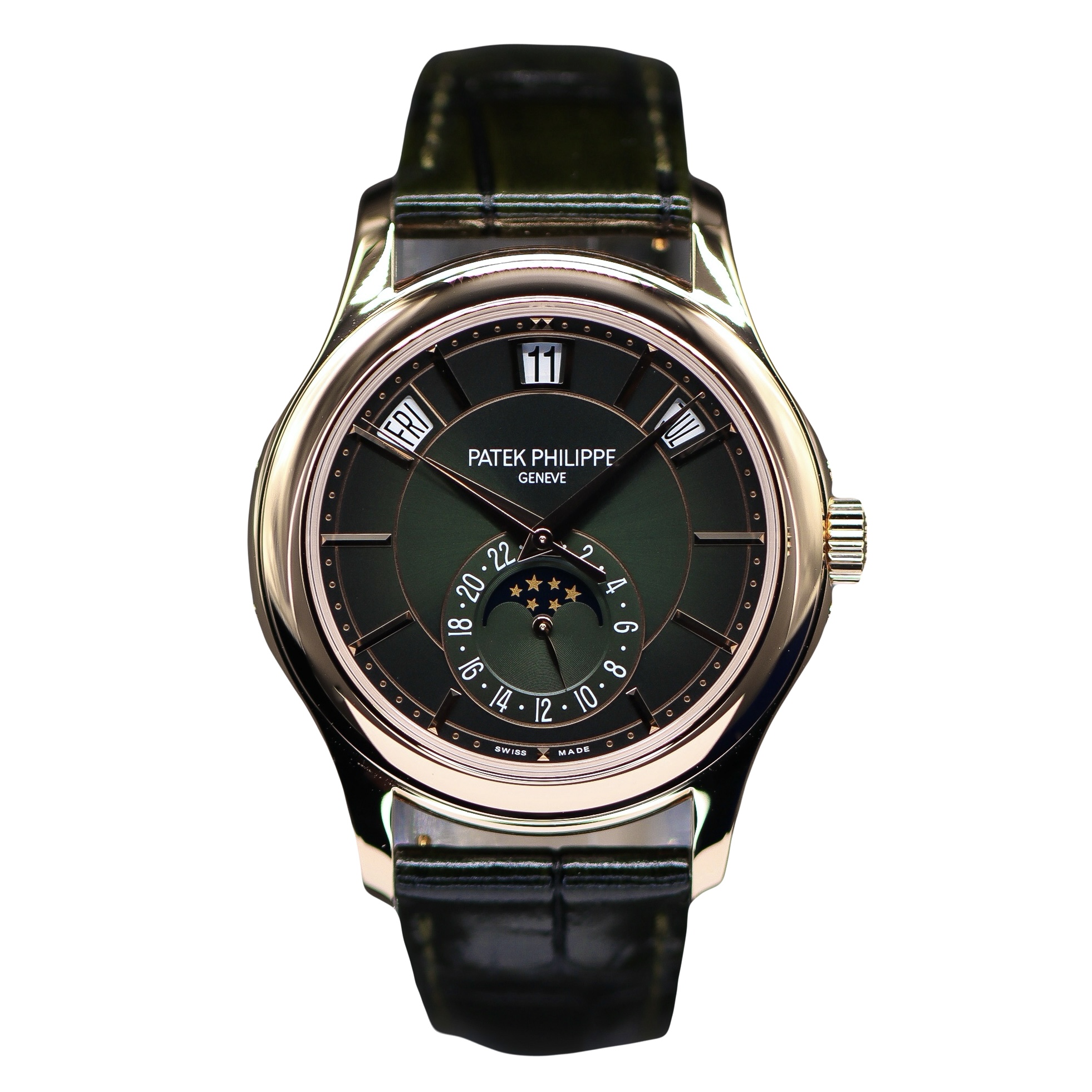 This Patek Philippe Complications 5205R-011 has a olive green baton dial and a leather strap. This Patek Philippe has undergone a thorough inspection of water resistance, accuracy, functionality and condition to determine the level of reconditioning required to meet our strict standards. It has also been referenced against technical documents and manufacturer records where available to ensure authenticity and a clean history. Our watches have a 24-month warranty for your peace of mind, in conjunction with any remaining manufacturer’s warranty from new or from service.