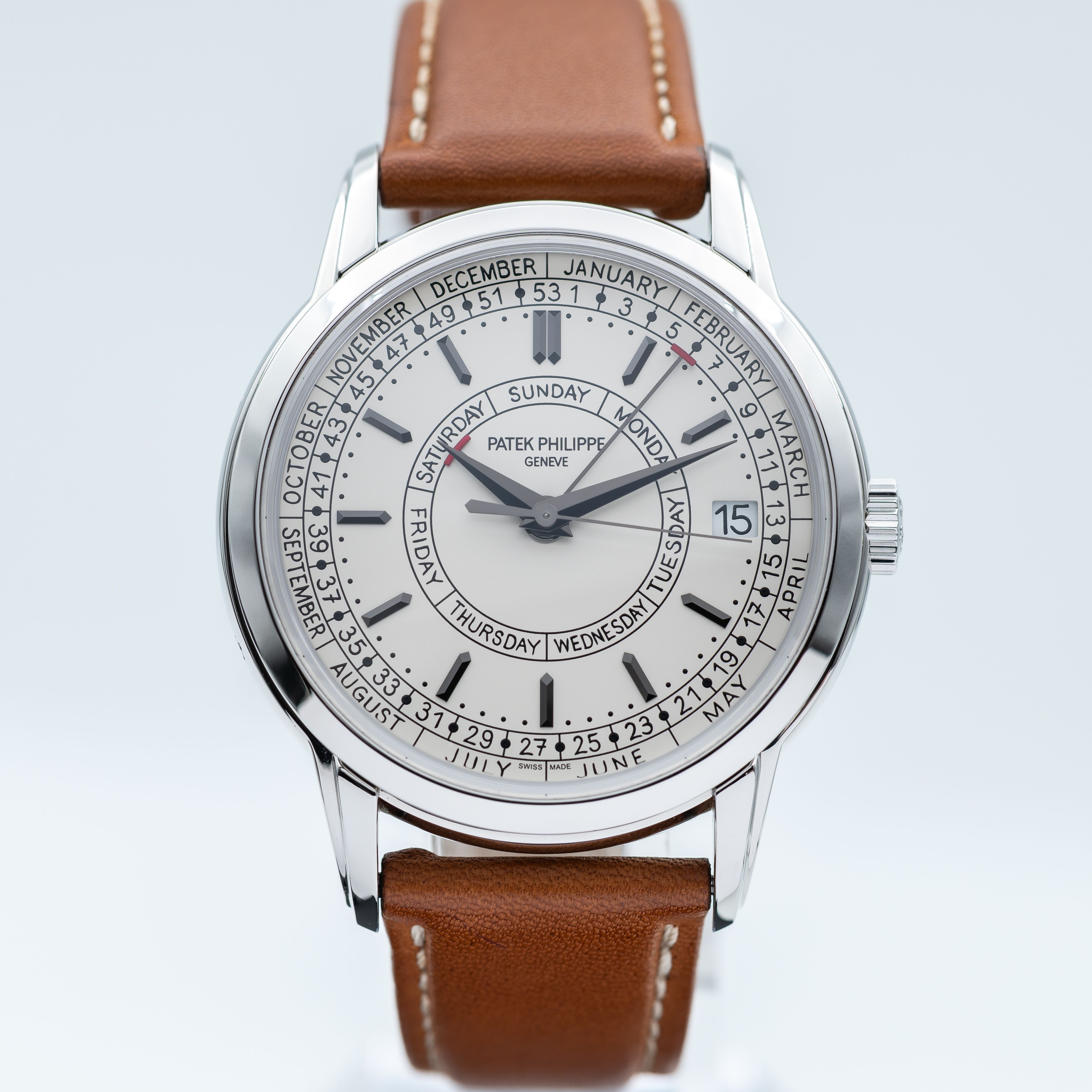 This Patek Philippe Complications 5212A-001 has a silver dial and a leather strap. This Patek Philippe has undergone a thorough inspection of water resistance, accuracy, functionality and condition to determine the level of reconditioning required to meet our strict standards. It has also been referenced against technical documents and manufacturer records where available to ensure authenticity and a clean history. All our watches have a 24-month warranty for your peace of mind.