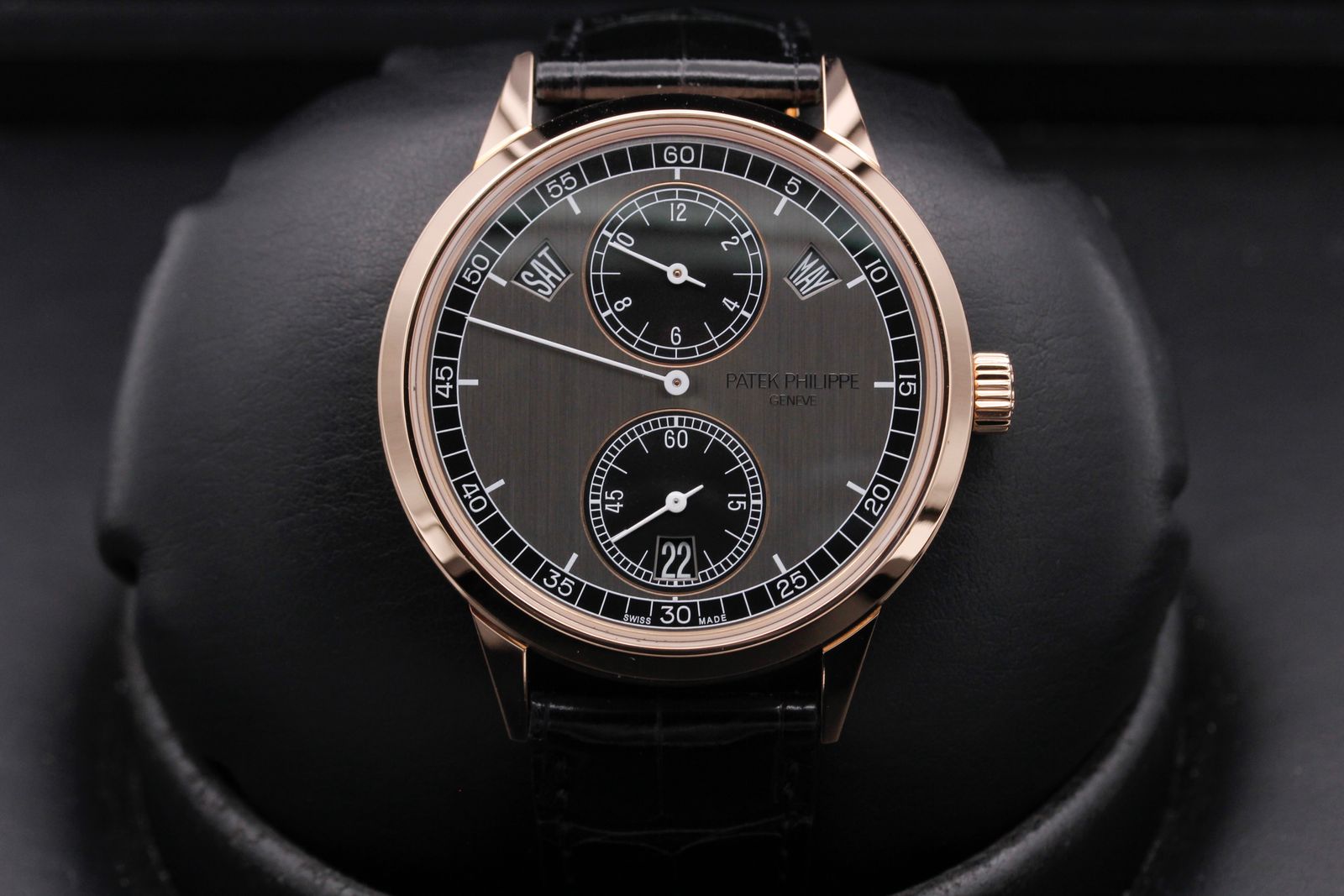 This unusual and distinctive model from arguably the world’s most prestigious watch manufacturer is an annual calendar with a regulator dial, meaning the hour, minute and second hands don’t share the same register. The hour and second hands can be found on the upper and lower subdials, respectively, while the minute hand uses the main dial. The ebony-black smaller dials stand out on the graphite dial and the white stick hands enhance the minimalist aesthetic. The annual calendar—meaning the date only needs to be manually adjusted at the end of February—is displayed via two windows for the day and month that lie either side of the hour subdial while the date is discreetly displayed in a small aperture at 6 o’clock, completing the symmetry. Fittingly for such a watch, even the movement is unconventional. It’s run on an automatic 31-260 REG QA movement with gold micro-rotor, visible through the exhibition caseback.