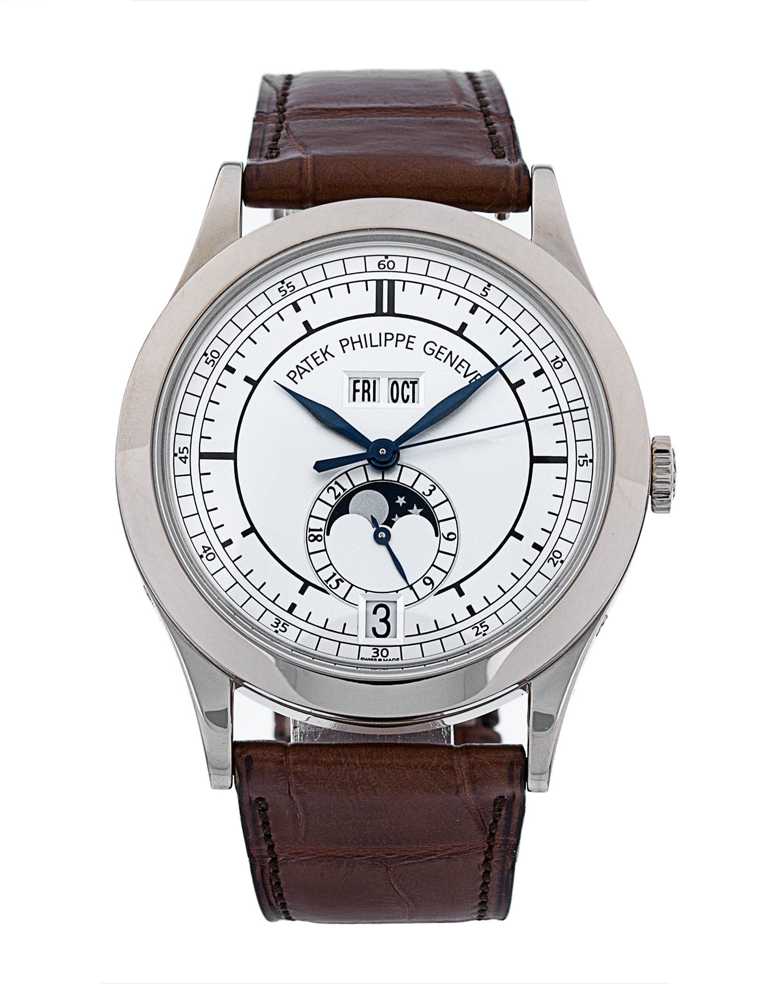 This Patek Philippe Complications 5396G-001 has a silver baton dial and a leather strap. This Patek Philippe has undergone a thorough inspection of water resistance, accuracy, functionality and condition to determine the level of reconditioning required to meet our strict standards. It has also been referenced against technical documents and manufacturer records where available to ensure authenticity and a clean history. All our watches have a 24-month warranty for your peace of mind.