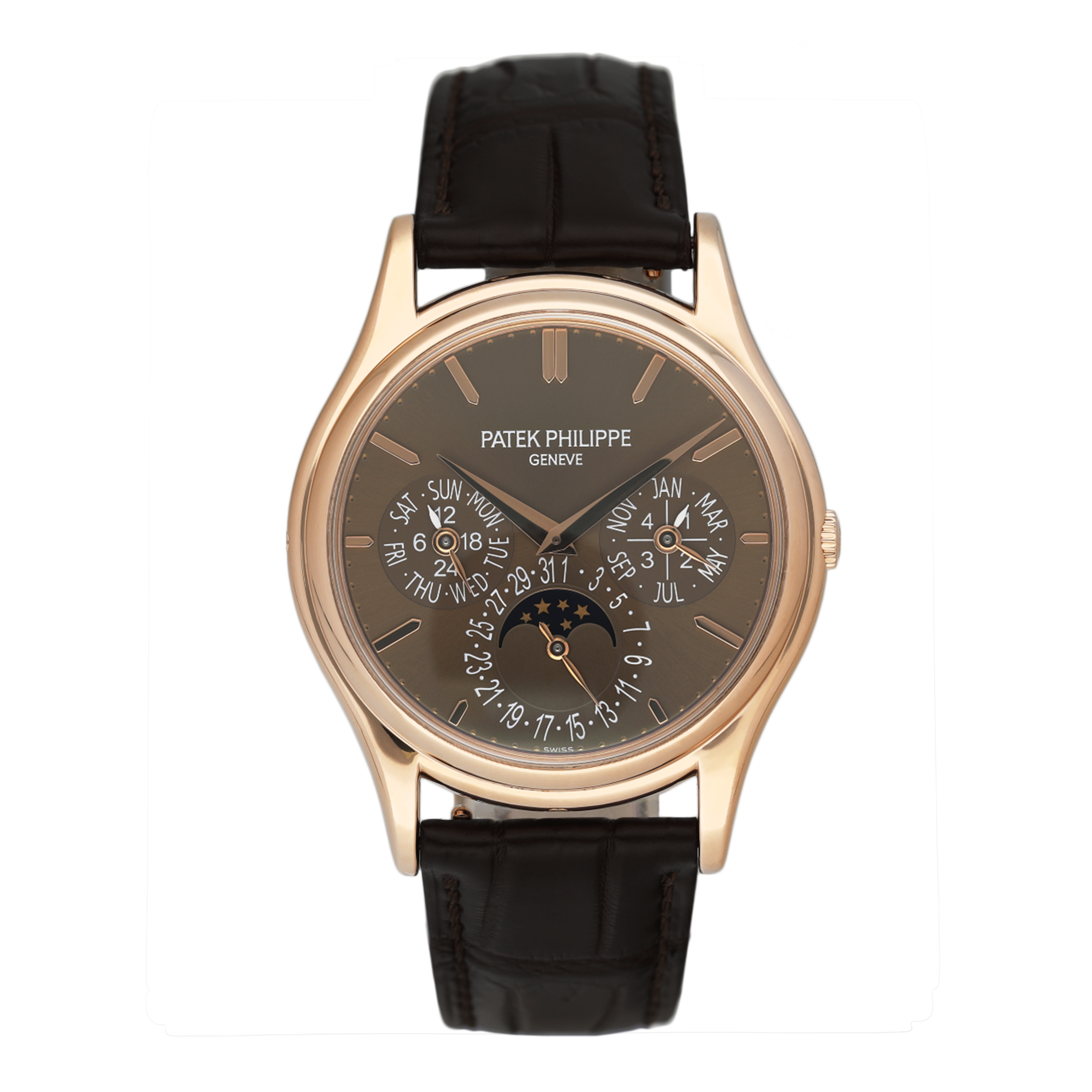 This Patek Philippe Grand Complications 5140R-001 has a brown baton dial and a leather strap. This Patek Philippe has undergone a thorough inspection of water resistance, accuracy, functionality and condition to determine the level of reconditioning required to meet our strict standards. It has also been referenced against technical documents and manufacturer records where available to ensure authenticity and a clean history. All our watches have a 24-month warranty for your peace of mind.