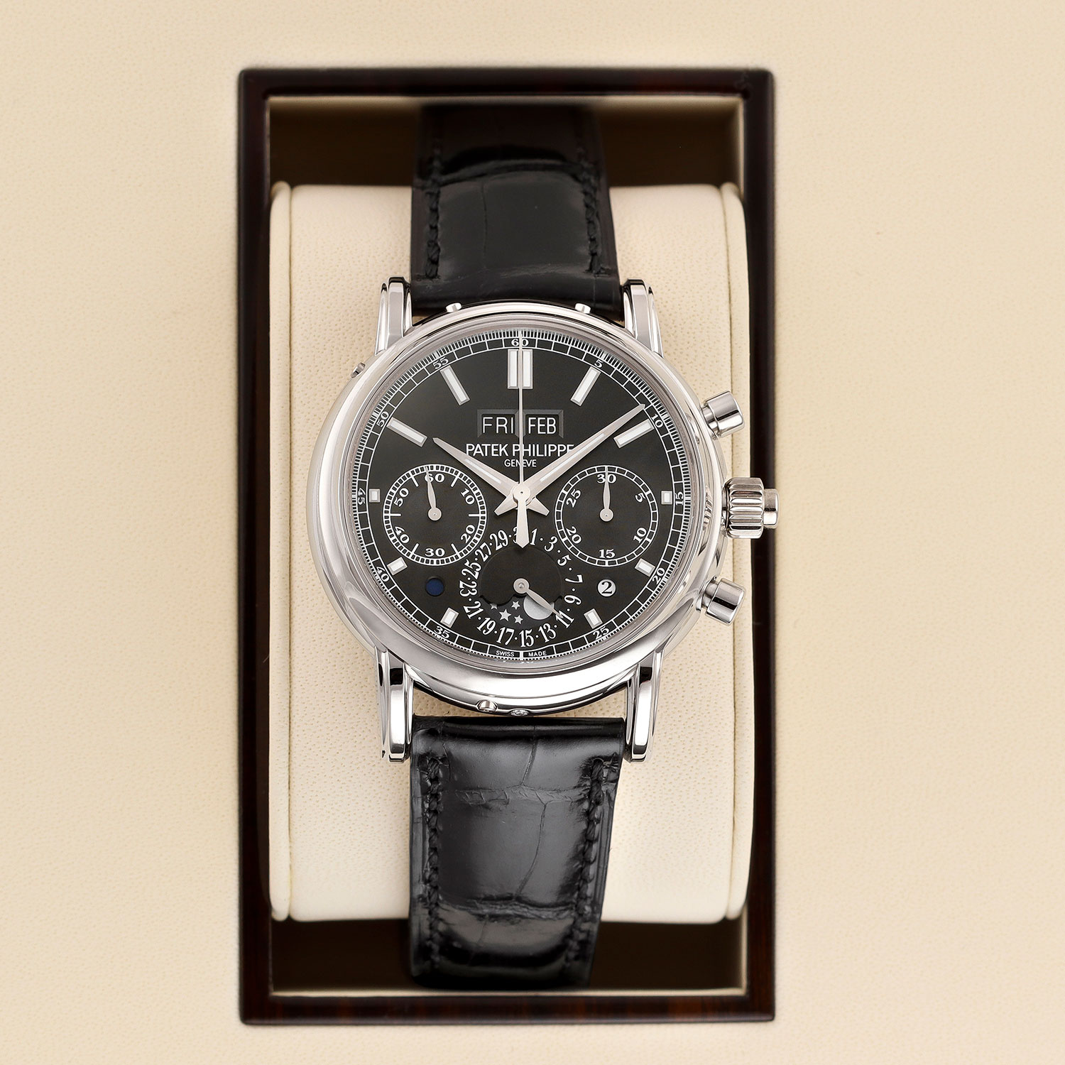 This Patek Philippe Grand Complications 5204P-011 has a black baton dial and a leather strap. This Patek Philippe has undergone a thorough inspection of water resistance, accuracy, functionality and condition to determine the level of reconditioning required to meet our strict standards. It has also been referenced against technical documents and manufacturer records where available to ensure authenticity and a clean history. All our watches have a 24-month warranty for your peace of mind.