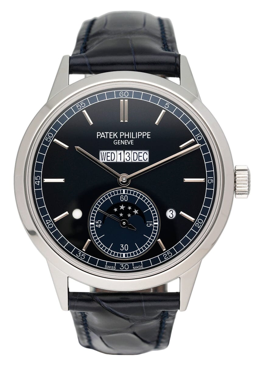 This Patek Philippe Grand Complications 5236P-001 has a blue baton dial and a leather strap. This Patek Philippe has undergone a thorough inspection of water resistance, accuracy, functionality and condition to determine the level of reconditioning required to meet our strict standards. It has also been referenced against technical documents and manufacturer records where available to ensure authenticity and a clean history. All our watches have a 24-month warranty for your peace of mind.