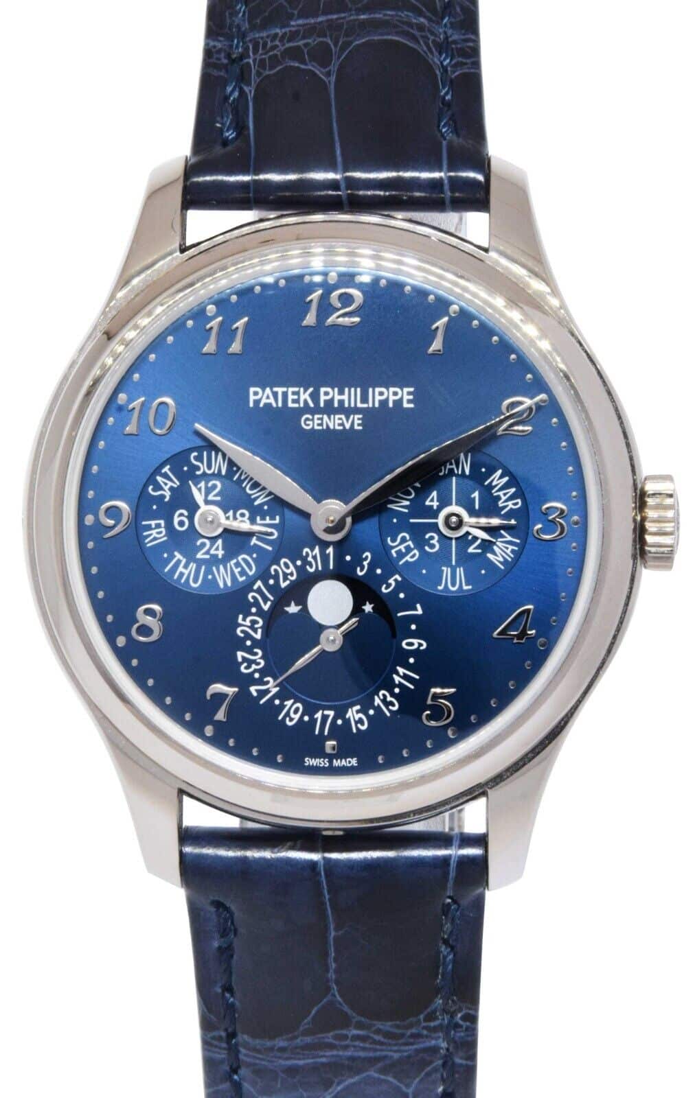 This Patek Philippe Grand Complications 5327G-001 has a blue arabic dial and a leather strap. This Patek Philippe has undergone a thorough inspection of water resistance, accuracy, functionality and condition to determine the level of reconditioning required to meet our strict standards. It has also been referenced against technical documents and manufacturer records where available to ensure authenticity and a clean history. All our watches have a 24-month warranty for your peace of mind.
