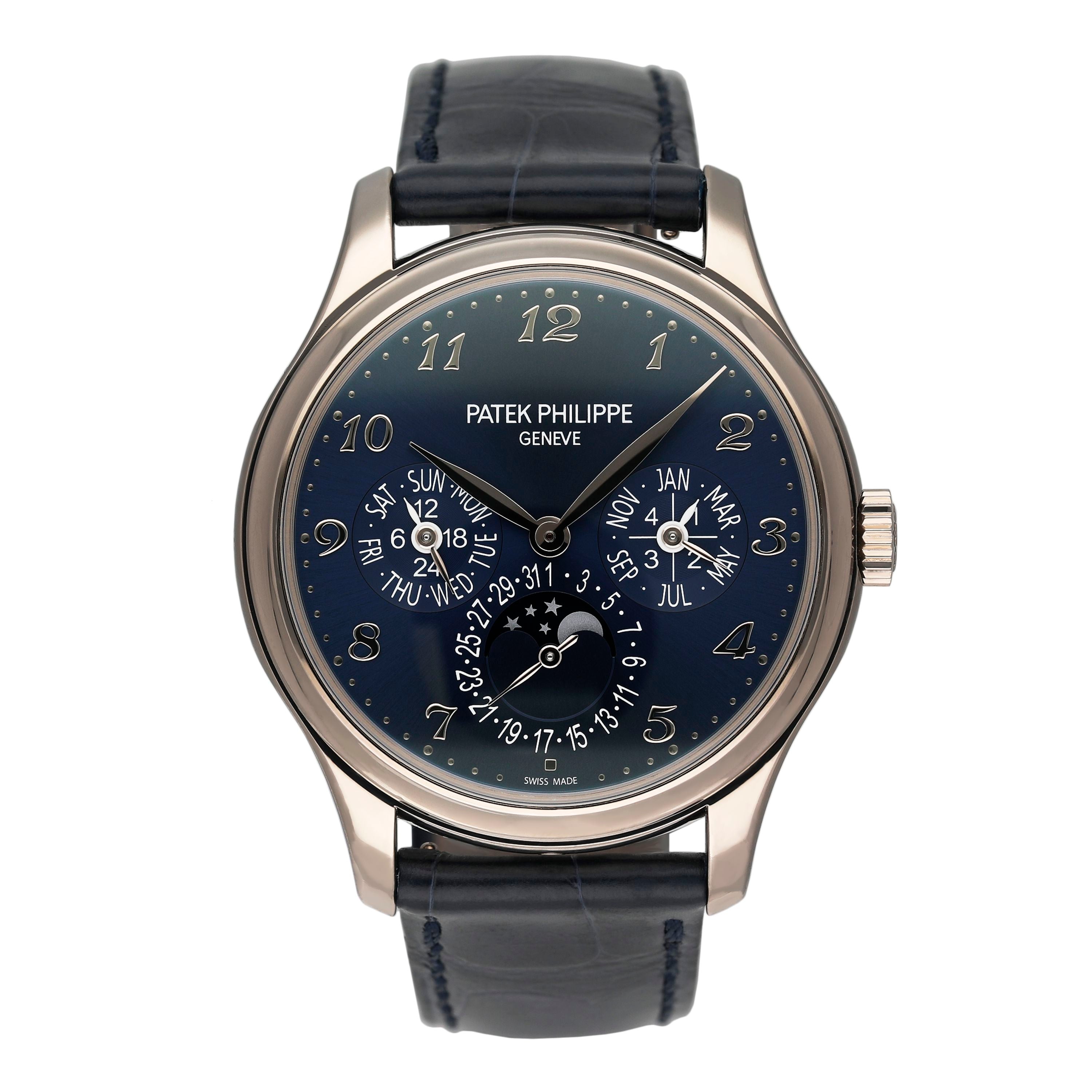 This Patek Philippe Grand Complications 5327G-001 has a blue arabic dial and a leather strap. This Patek Philippe has undergone a thorough inspection of water resistance, accuracy, functionality and condition to determine the level of reconditioning required to meet our strict standards. It has also been referenced against technical documents and manufacturer records where available to ensure authenticity and a clean history. All our watches have a 24-month warranty for your peace of mind.