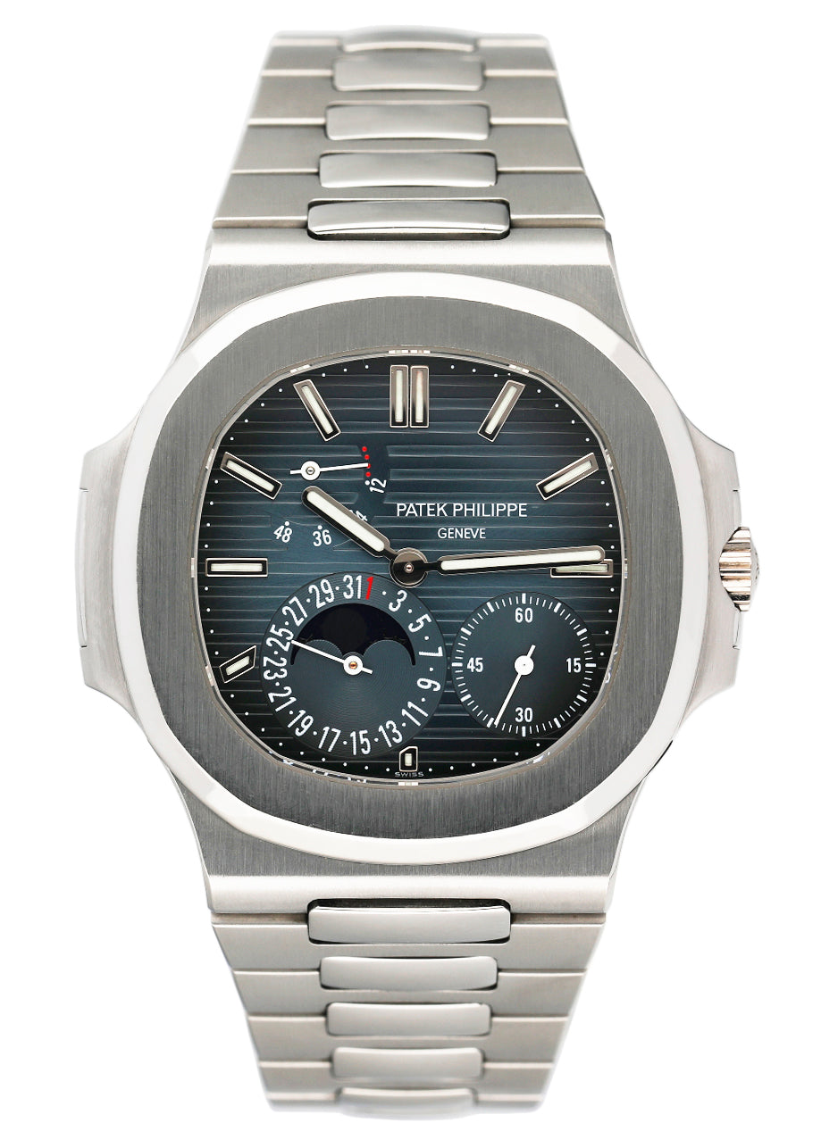 This Patek Philippe Nautilus 5712/1A-001 has a black & blue dial and a bracelet strap. This Patek Philippe has undergone a thorough inspection of water resistance, accuracy, functionality and condition to determine the level of reconditioning required to meet our strict standards. It has also been referenced against technical documents and manufacturer records where available to ensure authenticity and a clean history. All our watches have a 24-month warranty for your peace of mind.