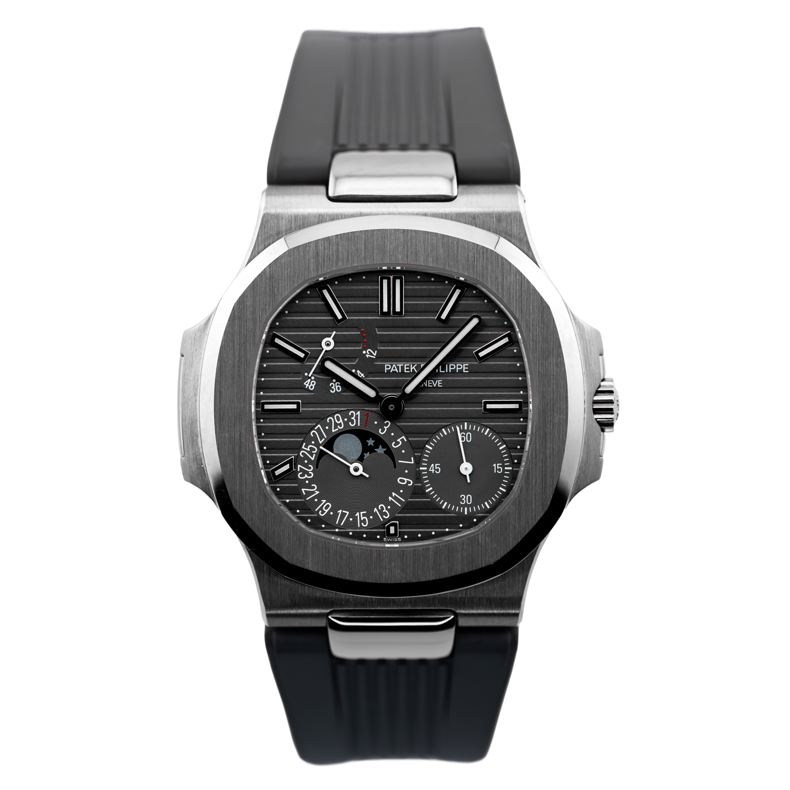 This Patek Philippe Nautilus 5712G-001 has a grey baton dial and a rubber strap. This Patek Philippe has undergone a thorough inspection of water resistance, accuracy, functionality and condition to determine the level of reconditioning required to meet our strict standards. It has also been referenced against technical documents and manufacturer records where available to ensure authenticity and a clean history. All our watches have a 24-month warranty for your peace of mind.
