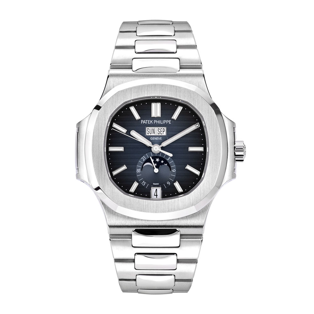 Like many of Gerald Genta’s famous watches, the Nautilus is a horological legend. Patek Philippe's most well-known and desirable sports watch, it's celebrated for some of the best examples of emblematic Genta trademarks: large, angular bezel, comparatively thin case, integrated bracelet and bold, if straightforward, dial. The design is based on the traditional shape of portholes, up to and including the hinges often found on the sides—hence the Nautilus' unmistakable 'ears'. This stainless-steel annual calendar model features the signature horizontally embossed dial in the very same gradient deep-blue as the original Nautilus from 1976. It’s populated by a date window at 6 o’clock and a day and month aperture below 12 o’clock, with a subdial for a 24-hour display and moon phase. Through the sapphire caseback is displayed the self-winding calibre 240 PS IRM C LU with 22k yellow-gold rotor decorated with the Calatrava cross and cote de Geneve stripes. This is a stunning version of the most sought-after model in Patek Philippe’s illustrious catalogue.