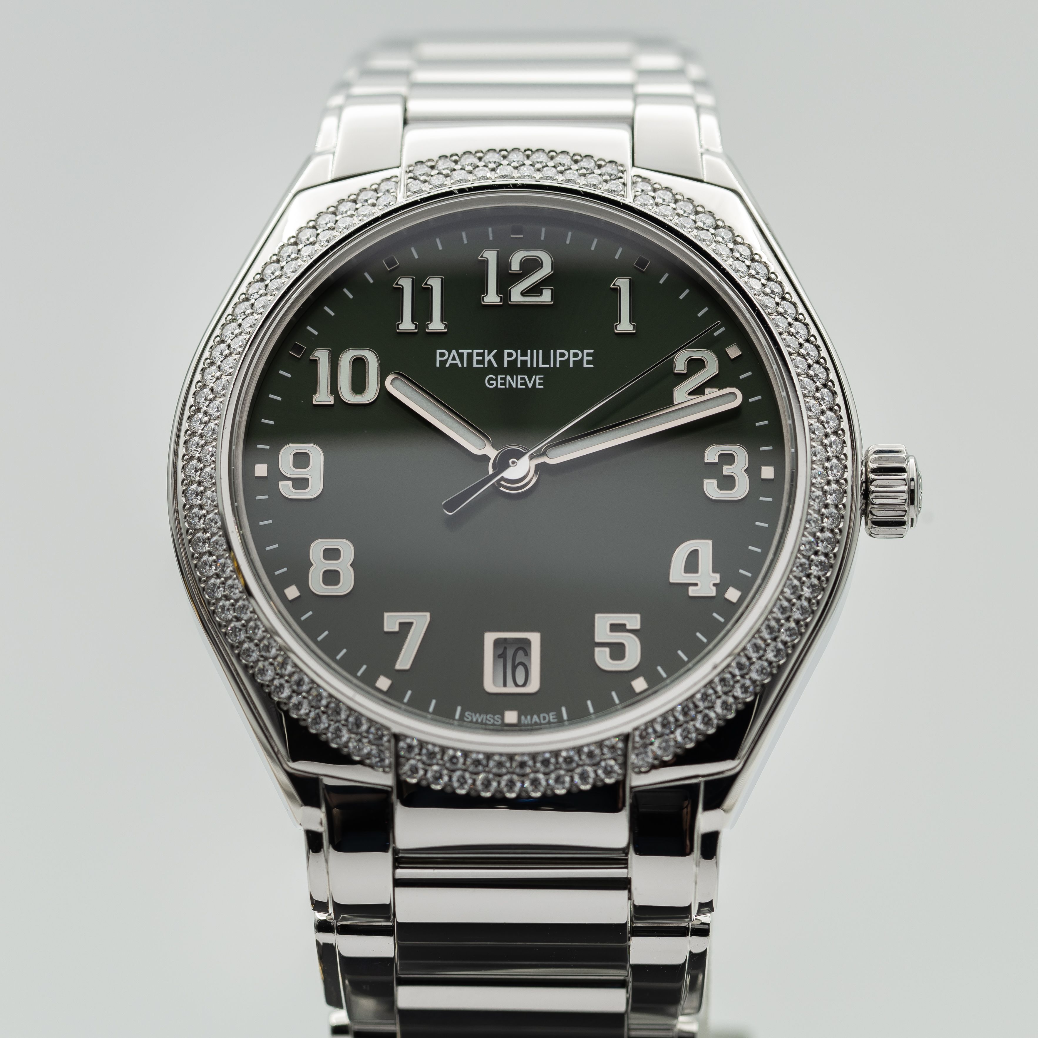 This Patek Philippe Twenty-4 7300/1200A-011 has a green arabic dial and a bracelet strap. This Patek Philippe has undergone a thorough inspection of water resistance, accuracy, functionality and condition to determine the level of reconditioning required to meet our strict standards. It has also been referenced against technical documents and manufacturer records where available to ensure authenticity and a clean history. All our watches have a 24-month warranty for your peace of mind.
