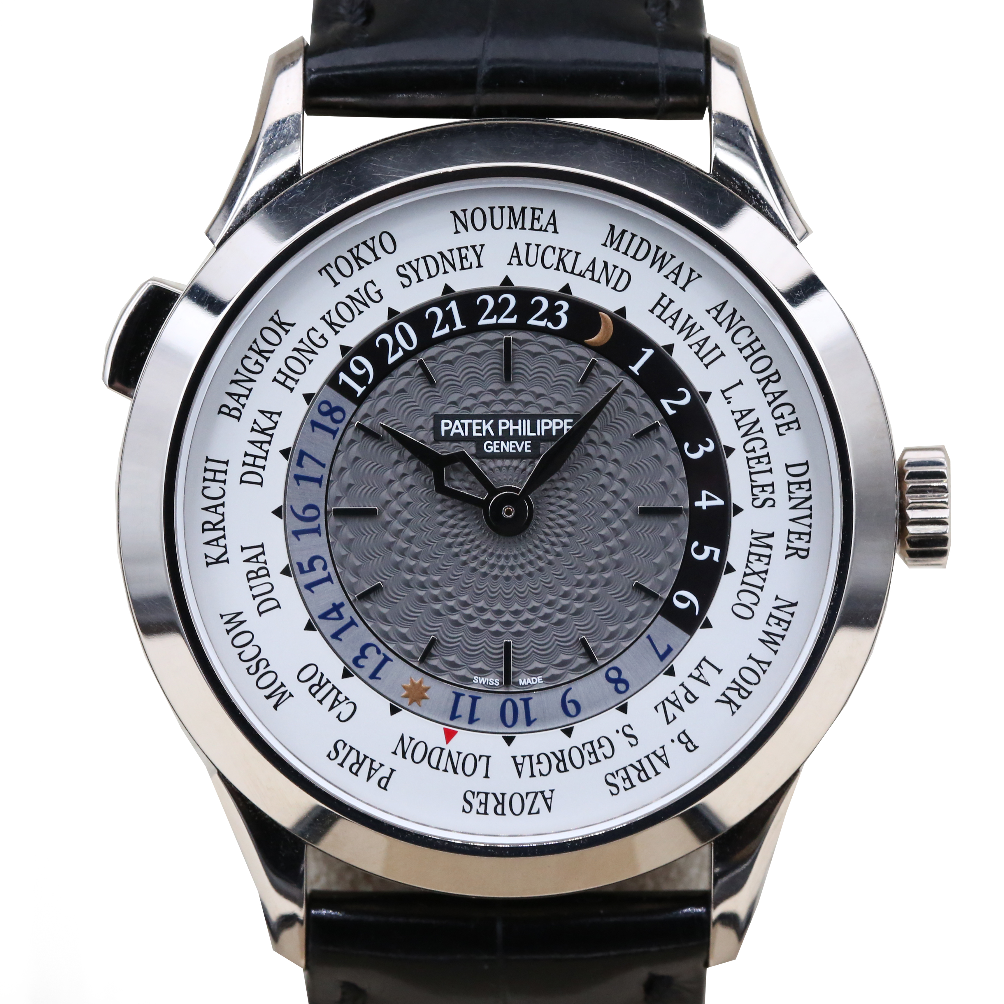 This Patek Philippe World Time 5230G-001 has a silver dial and a leather strap. This Patek Philippe has undergone a thorough inspection of water resistance, accuracy, functionality and condition to determine the level of reconditioning required to meet our strict standards. It has also been referenced against technical documents and manufacturer records where available to ensure authenticity and a clean history. All our watches have a 24-month warranty for your peace of mind.