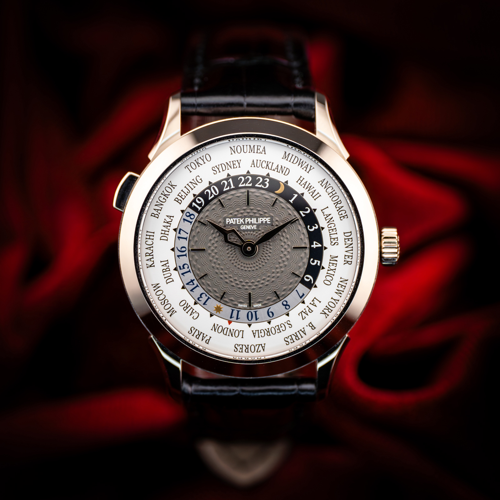This Patek Philippe World Time 5230G-014 has a grey dial and a leather strap. This Patek Philippe has undergone a thorough inspection of water resistance, accuracy, functionality and condition to determine the level of reconditioning required to meet our strict standards. It has also been referenced against technical documents and manufacturer records where available to ensure authenticity and a clean history. Our watches have a 24-month warranty for your peace of mind, in conjunction with any remaining manufacturer’s warranty from new or from service.