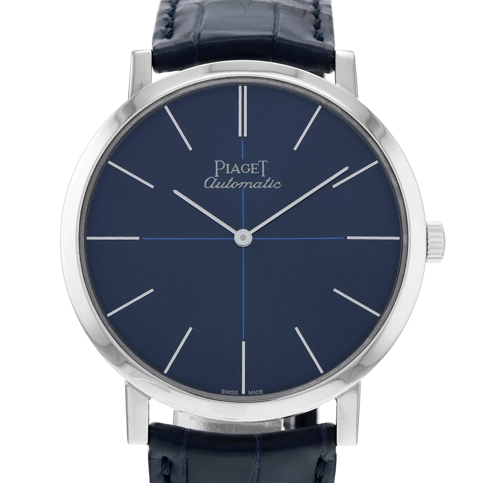 This Piaget Altiplano G0A42105 has a blue baton dial and a leather strap. This Piaget has undergone a thorough inspection of water resistance, accuracy, functionality and condition to determine the level of reconditioning required to meet our strict standards. It has also been referenced against technical documents and manufacturer records where available to ensure authenticity and a clean history. All our watches have a 24-month warranty for your peace of mind.