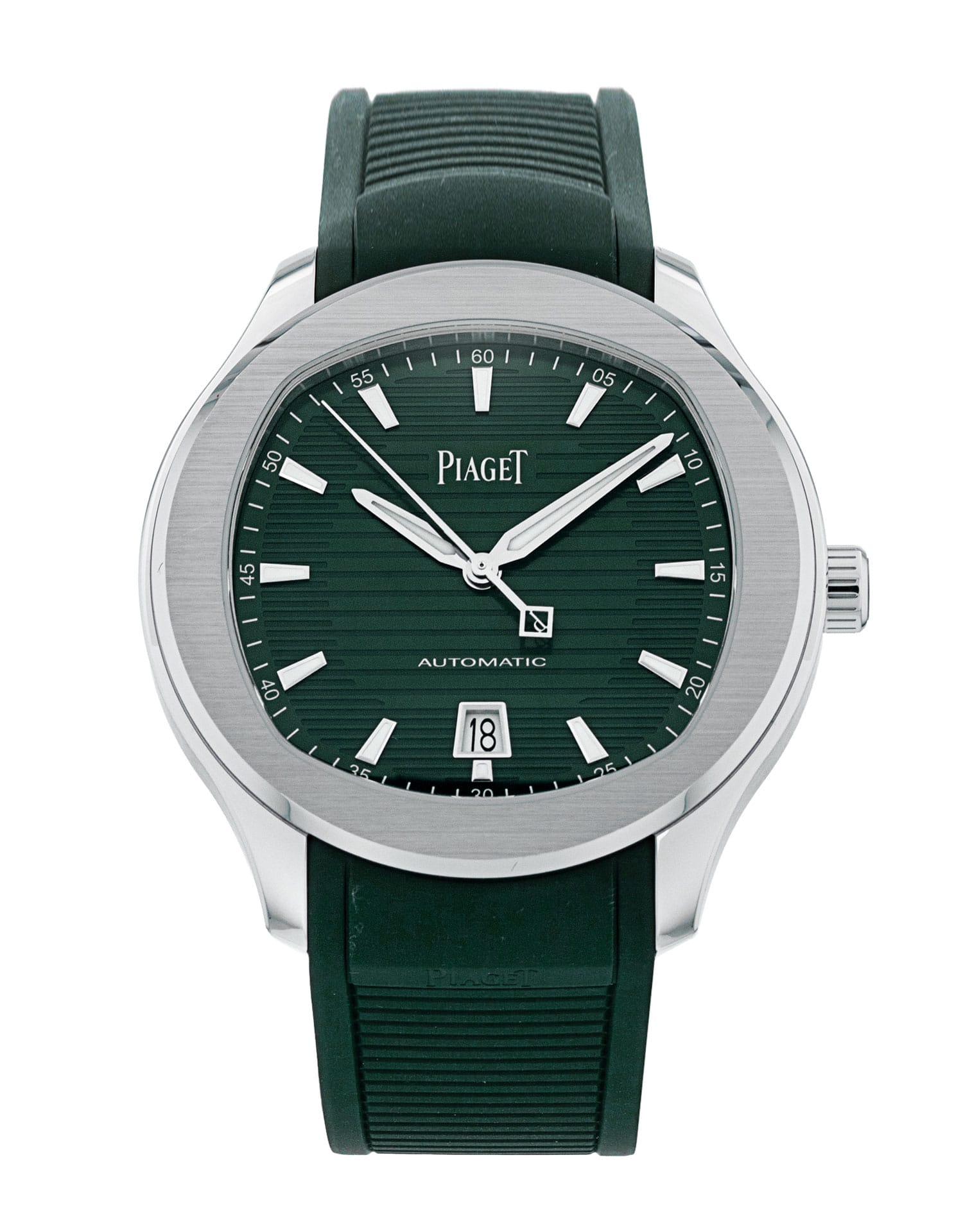 This Piaget Polo G0A48022 has a green baton dial and a rubber strap. This Piaget has undergone a thorough inspection of water resistance, accuracy, functionality and condition to determine the level of reconditioning required to meet our strict standards. It has also been referenced against technical documents and manufacturer records where available to ensure authenticity and a clean history. Our watches have a 24-month warranty for your peace of mind, in conjunction with any remaining manufacturer’s warranty from new or from service.