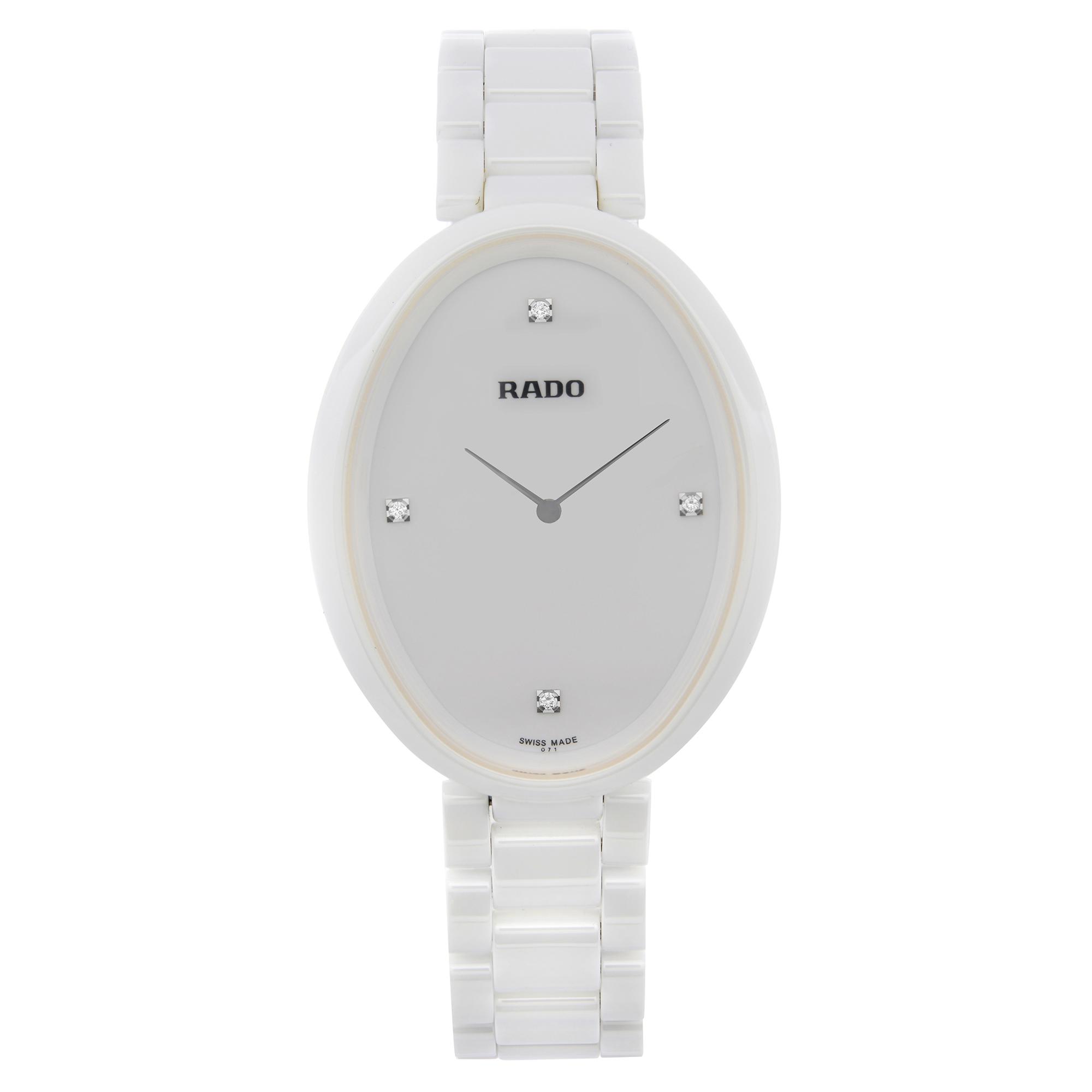 This Rado eSenza R53092712 has a white diamond dial and a bracelet strap. This Rado has undergone a thorough inspection of water resistance, accuracy, functionality and condition to determine the level of reconditioning required to meet our strict standards. It has also been referenced against technical documents and manufacturer records where available to ensure authenticity and a clean history. All our watches have a 24-month warranty for your peace of mind.