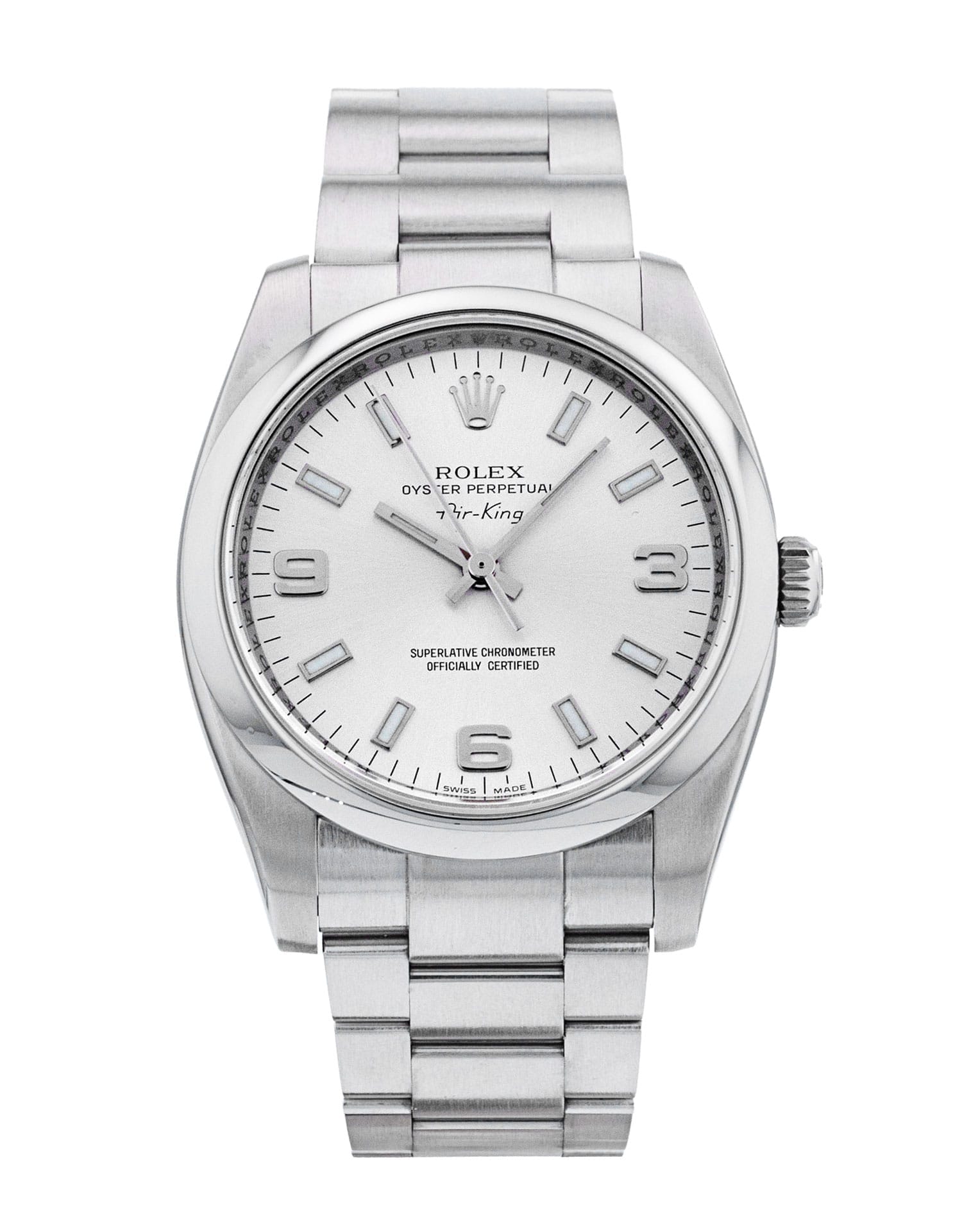 This Rolex Air-King 114200 has a silver quarter arabic dial and a bracelet strap. This Rolex has undergone a thorough inspection of water resistance, accuracy, functionality and condition to determine the level of reconditioning required to meet our strict standards. It has also been referenced against technical documents and manufacturer records where available to ensure authenticity and a clean history. Our watches have a 24-month warranty for your peace of mind, in conjunction with any remaining manufacturer’s warranty from new or from service. To maintain the manufacturer’s warranty on this watch, it has not been polished in our service centre.