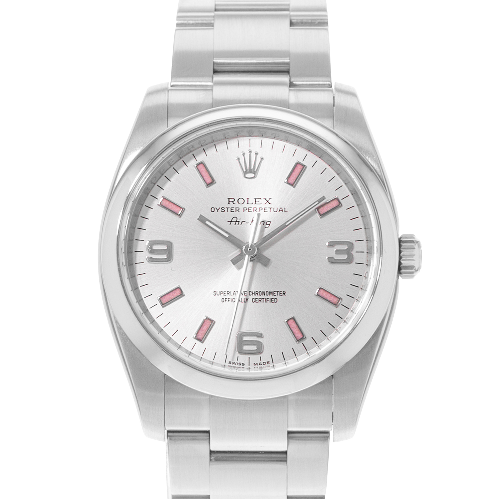 This Rolex Air-King 114200 has a silver quarter arabic dial and a bracelet strap. This Rolex has undergone a thorough inspection of water resistance, accuracy, functionality and condition to determine the level of reconditioning required to meet our strict standards. It has also been referenced against technical documents and manufacturer records where available to ensure authenticity and a clean history. All our watches have a 24-month warranty for your peace of mind. One of our skilled polishing technicians has removed marks on the case and bracelet of this watch, brought about by daily wear and tear, which is why this watch does not come with the remaining manufacturer’s warranty.