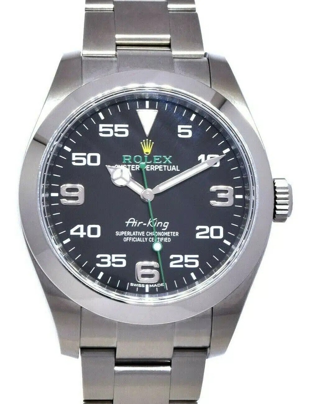 This Rolex Air-King 116900 has a black arabic dial and a bracelet strap. This Rolex has undergone a thorough inspection of water resistance, accuracy, functionality and condition to determine the level of reconditioning required to meet our strict standards. It has also been referenced against technical documents and manufacturer records where available to ensure authenticity and a clean history. All our watches have a 24-month warranty for your peace of mind. One of our skilled polishing technicians has removed marks on the case and bracelet of this watch, brought about by daily wear and tear, which is why this watch does not come with the remaining manufacturer’s warranty.
