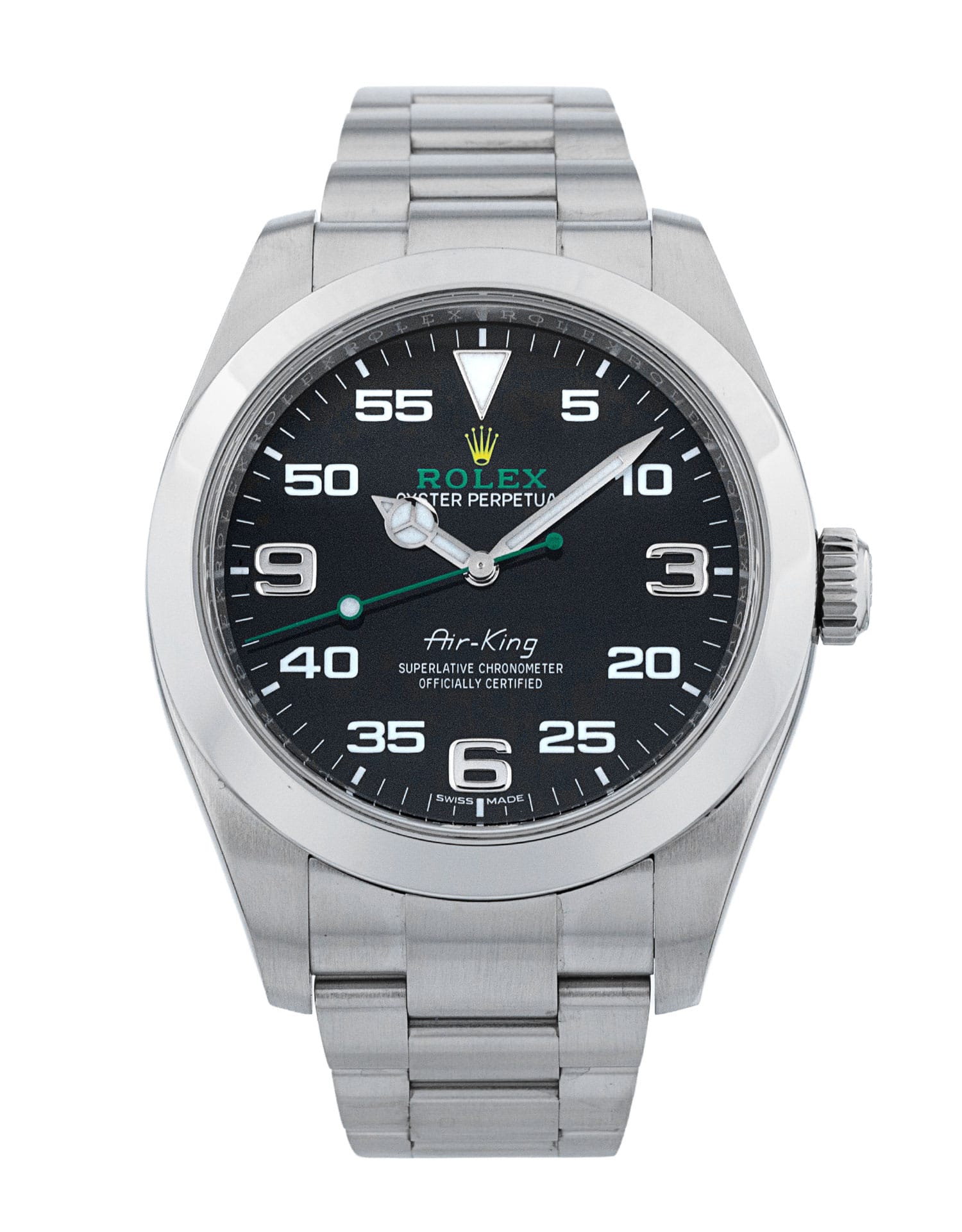 This Rolex Air-King 116900 has a black arabic dial and a bracelet strap. This Rolex has undergone a thorough inspection of water resistance, accuracy, functionality and condition to determine the level of reconditioning required to meet our strict standards. It has also been referenced against technical documents and manufacturer records where available to ensure authenticity and a clean history. All our watches have a 24-month warranty for your peace of mind. One of our skilled polishing technicians has removed marks on the case and bracelet of this watch, brought about by daily wear and tear, which is why this watch does not come with the remaining manufacturer’s warranty.