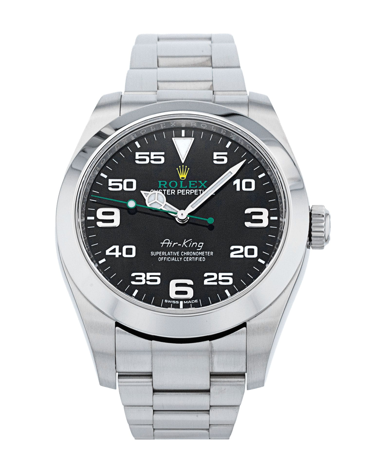 This Rolex Air-King 116900 has a black arabic dial and a bracelet strap. This Rolex has undergone a thorough inspection of water resistance, accuracy, functionality and condition to determine the level of reconditioning required to meet our strict standards. It has also been referenced against technical documents and manufacturer records where available to ensure authenticity and a clean history. All our watches have a 24-month warranty for your peace of mind. One of our skilled polishing technicians has removed marks on the case and bracelet of this watch, brought about by daily wear and tear, which is why this watch does not come with the remaining manufacturer’s warranty.