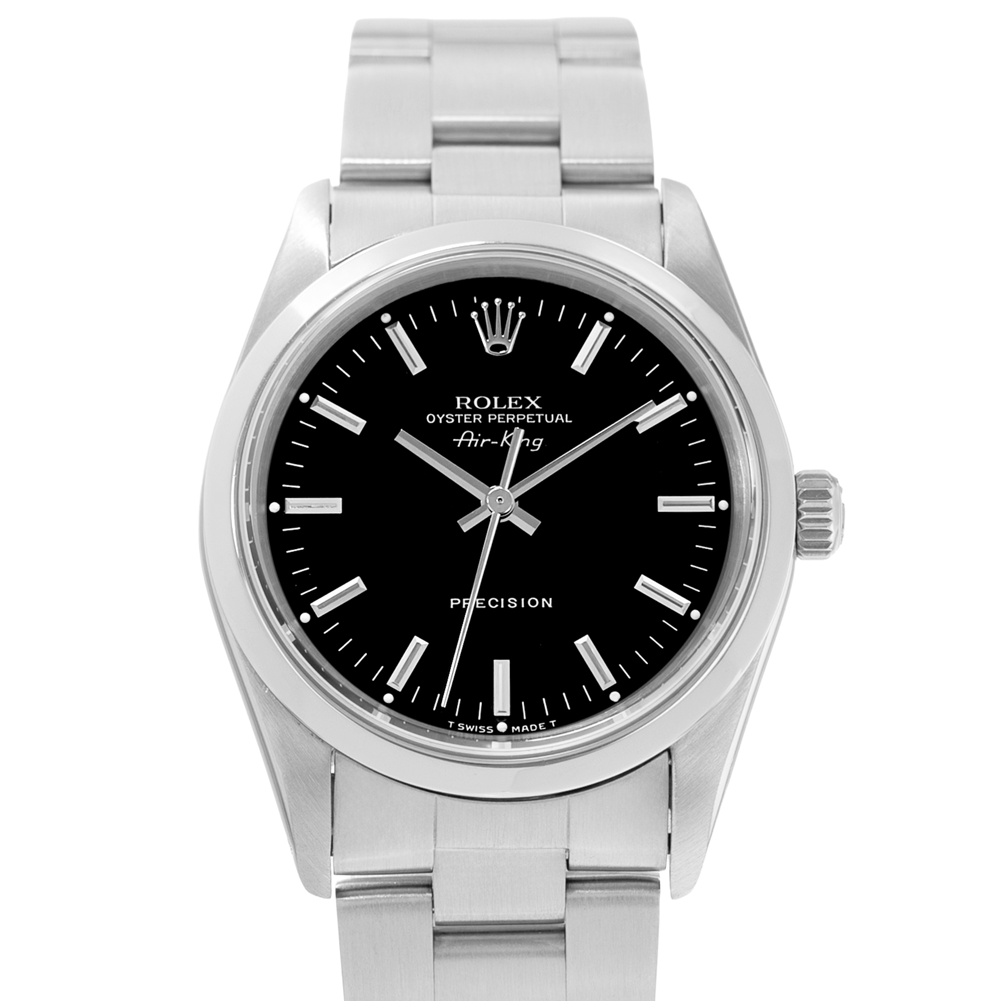 This Rolex Air-King 14000 has a black baton dial and a bracelet strap. This Rolex has undergone a thorough inspection of water resistance, accuracy, functionality and condition to determine the level of reconditioning required to meet our strict standards. It has also been referenced against technical documents and manufacturer records where available to ensure authenticity and a clean history. All our watches have a 24-month warranty for your peace of mind. One of our skilled polishing technicians has removed marks on the case and bracelet of this watch, brought about by daily wear and tear, which is why this watch does not come with the remaining manufacturer’s warranty.