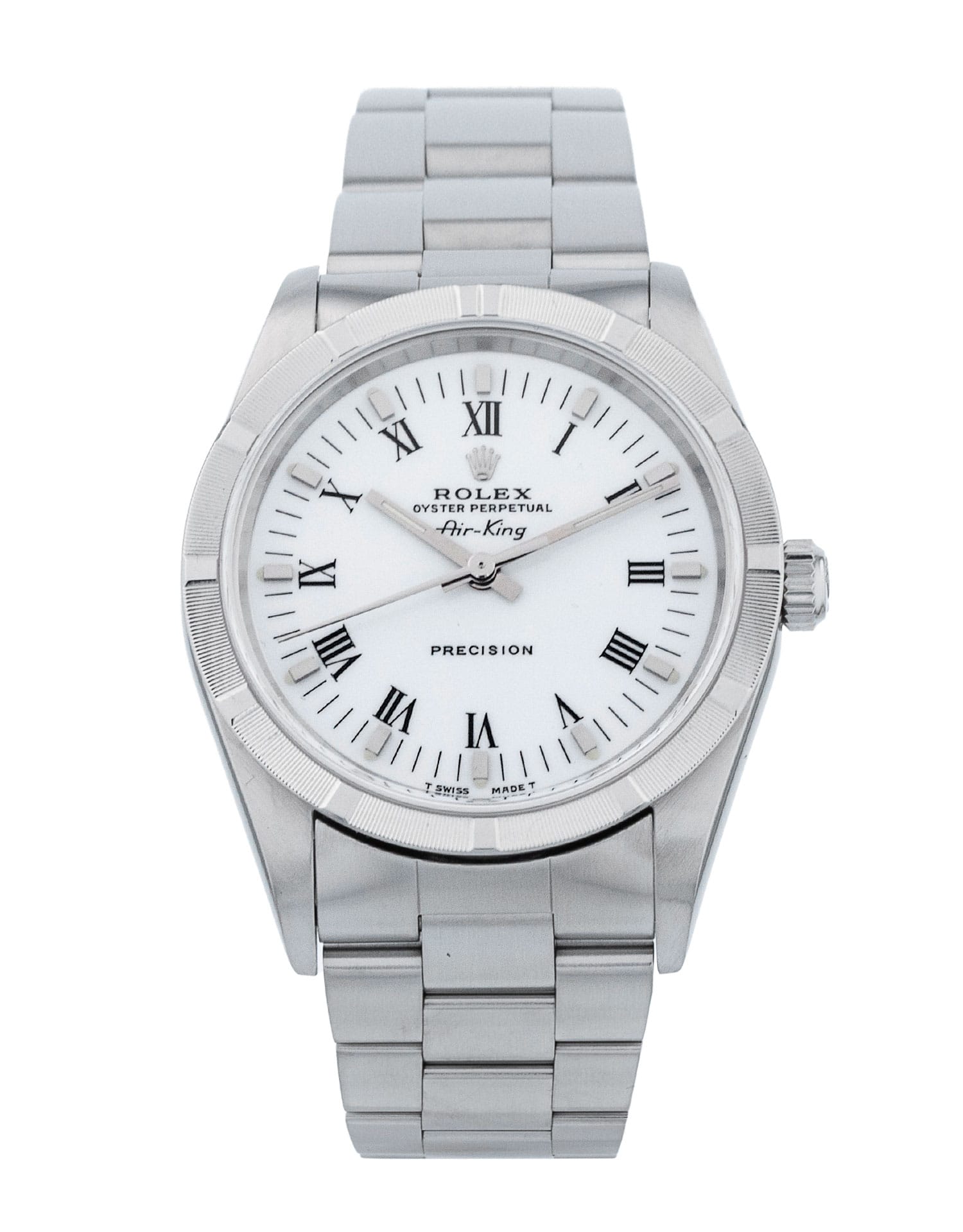 This Rolex Air-King 14010 has a white roman numeral dial and a bracelet strap. This Rolex has undergone a thorough inspection of water resistance, accuracy, functionality and condition to determine the level of reconditioning required to meet our strict standards. It has also been referenced against technical documents and manufacturer records where available to ensure authenticity and a clean history. All our watches have a 24-month warranty for your peace of mind. One of our skilled polishing technicians has removed marks on the case and bracelet of this watch, brought about by daily wear and tear, which is why this watch does not come with the remaining manufacturer’s warranty.